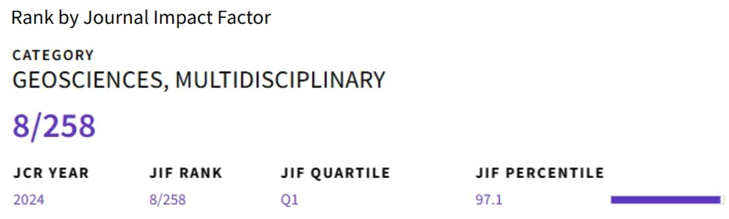 2025年6月18日,科睿唯安(Clarivate Analytics)发布了2024年《期刊引证报告》(Journal Citation Reports,简称JCR)。中国地质大学(北京)和北京大学共同主办的《地学前缘(英文)》(Geoscience Frontiers,简称 GSF)期刊继续保持稳定发展态势,影响因子为8.9,学科排名继续保持前列,稳居Q1区,位居全球258种地球科学及交叉学科类(Geosciences, Multidisciplinary)SCI 期刊第8位,学科排名前3%。
