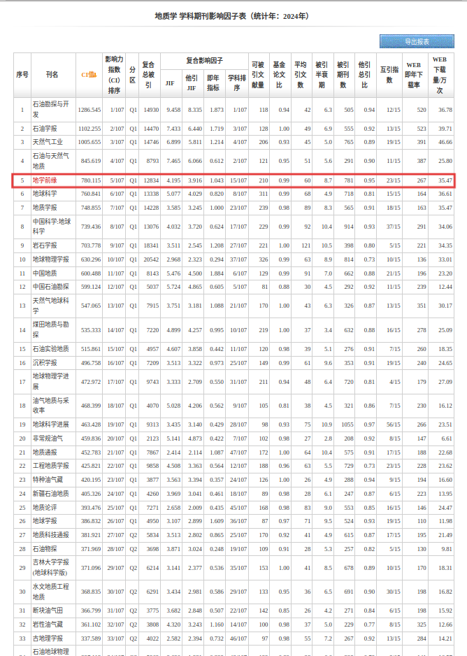 2025年11月13日,《中国学术期刊影响因子年报》(2025版)已发布。《地学前缘》2025版期刊复合影响因子为4.195,较2024版(3.672)提高了14.3%;他引影响因子为3.916,较2024版(3.297)提高了18.8%;2025版期刊影响力指数(CI)值为780.115,较2024版(620.45)提高了25.7%;“地质学”学科影响力指数(CI)值排序由2024版的8/106提升至2025版的5/107,稳居Q1分区。这些指标稳步提升,反映出本刊学术影响力与办刊质量的持续增强。