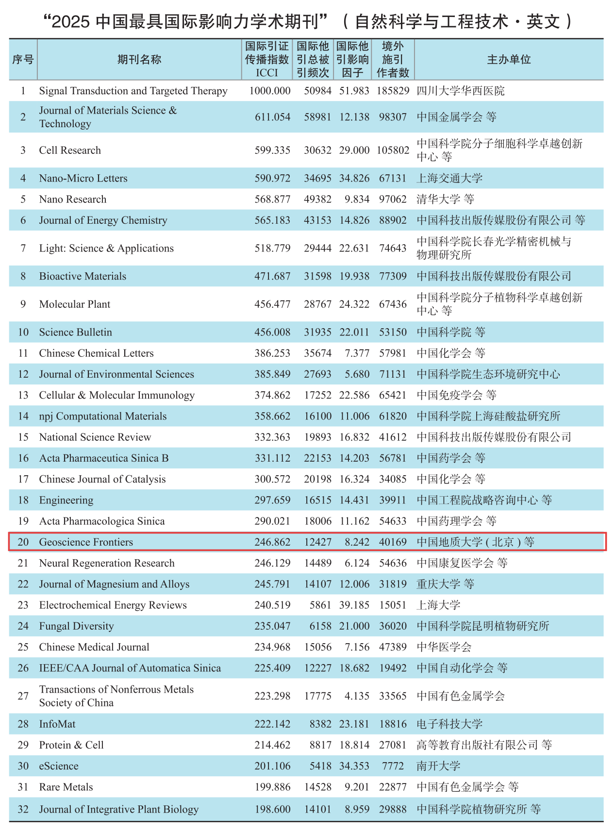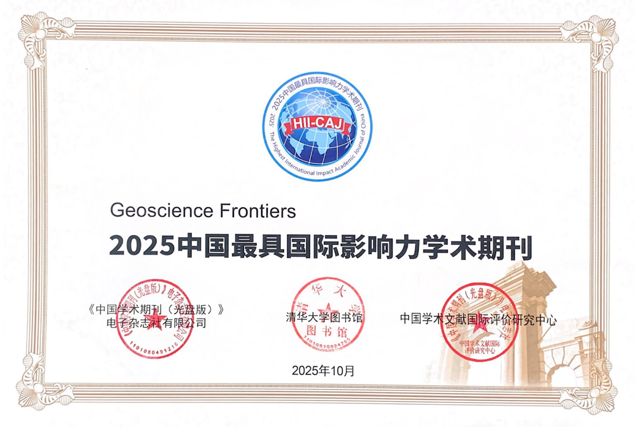 近日,由中国知网和清华大学图书馆联合研制的《中国学术期刊国际引证年报》(2025版)正式发布,《地学前缘(英文)》(Geoscience Frontiers,GSF)再度入选“中国最具国际影响力学术期刊(自然科学与工程技术·英文)”,连续12年获此殊荣。