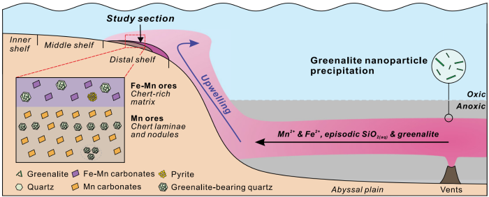 显生宙期间,海洋曾多次经历缺氧事件和海底热液活动,但直接沉积记录较为有限。铁蛇纹石(Fe2+3Si2O5(OH)4)是一种常见于前寒武含铁硅质岩和铁建造中的硅酸盐矿物(图1)。它通常以微米至纳米级颗粒或粉砂级凝絮体的形式保存在硅质岩中,也可呈现集合体形态。近年研究认为,原生铁蛇纹石形成于还原性海水环境中,或是由富铁海底热液与富硅的还原海水相互作用形成。大氧化事件(约24亿年)之前,铁蛇纹石的广泛出现指示全球海水具有富热液铁、硅和还原的状态。大氧化事件之后,铁蛇纹石仅在少数铁建造中有报道,反映了表层氧化海水之下存在底层富铁还原海水。在显生宙沉积记录中,原生铁蛇纹石较为罕见,这可能是因为在显生宙总体氧化的海洋中,铁被迅速氧化为不溶的氧化物或氢氧化物。然而,显生宙海洋发生的缺氧事件和热液活动是否曾形成并保存原生铁蛇纹石,至今仍不明确。