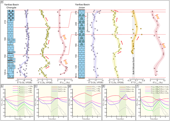 (1)本研究识别出铁岭组二段存在两次δ7Li负偏(图2)。基于动态盒子模型(图2),这两次δ7Li负偏被解释为两次增强的大陆化学风化。