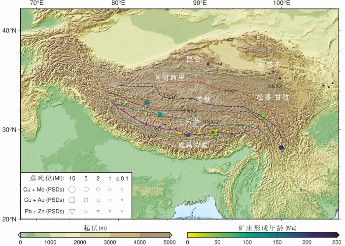 图1 青藏高原地形、主要地体及斑岩系统矿床分布图