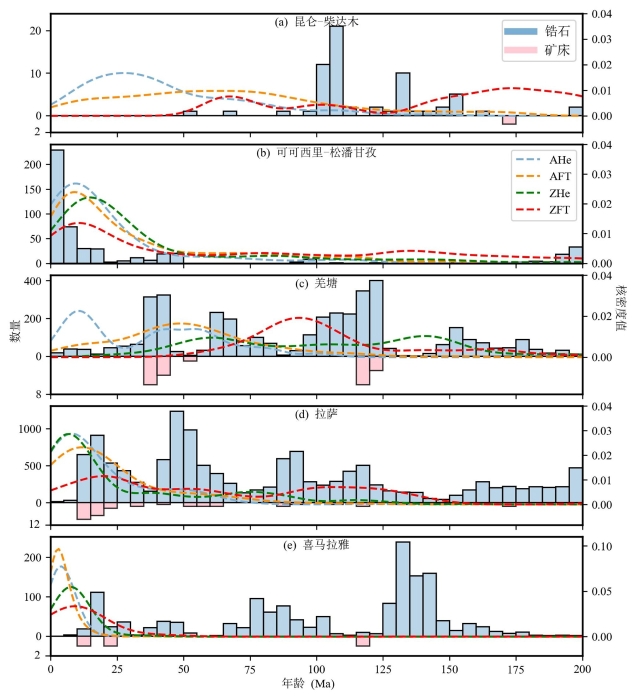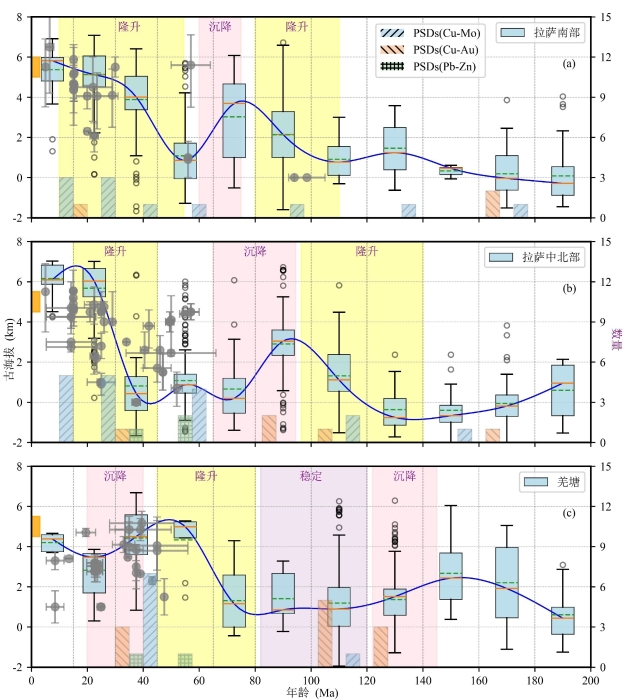 图3 青藏高原古海拔重建结果。(a-c)每 15/20 Ma 时间窗内的区域古海拔汇总,蓝色实线表征古海拔随时间的变化趋势;灰色散点为文献记录的古海拔数据;彩色直方图表示对应时间窗内新形成斑岩矿床的数量。左侧 y 轴的橙色范围表示该区域现今海拔范围。