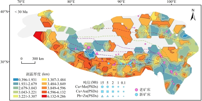 (3)高剥露区域普遍对应较少的斑岩系统矿床,且矿床吨位整体偏小,表明强烈剥蚀不利于矿化系统的长期保存。相对低剥露区域可能仍保存深部未出露矿体,因而在勘查实践中可作为潜在重要靶区优先关注(图4)。