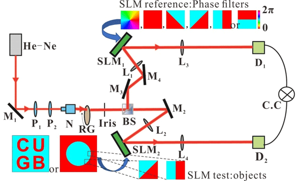 1、提出了一种新型的空间滤波相衬成像方案。传统的涡旋滤波成像是在物体的傅里叶频谱面滤波,我们提出的新型滤波方案是将被测的相位物体和涡旋滤波片都放置于光源的像平面上,通过逐点扫描的成像方式实现涡旋滤波相衬成像。这一方案不需要附加的光学器件,同时消除了传统方法对涡旋滤波片空间位置的限定。