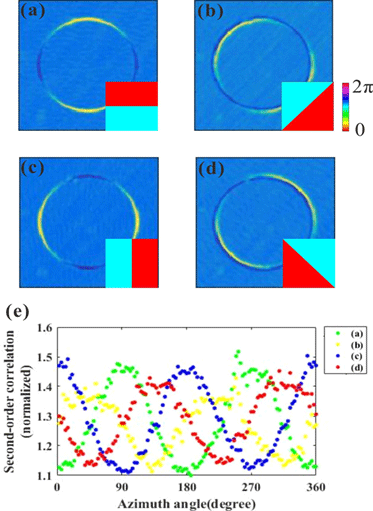 3、热光源量子成像系统物理本质的实验证明。我们选取各向同性的相位圆作为待测物体,通过逐点二阶关联测量获得了边缘增强图像以及圆环边界处的强度值随方位角变化的曲线(图3所示)。利用散点曲线图计算出贝尔表达式S值小于2,由此证明随机热光源的量子成像系统在空间自由度上具有经典物理特性。