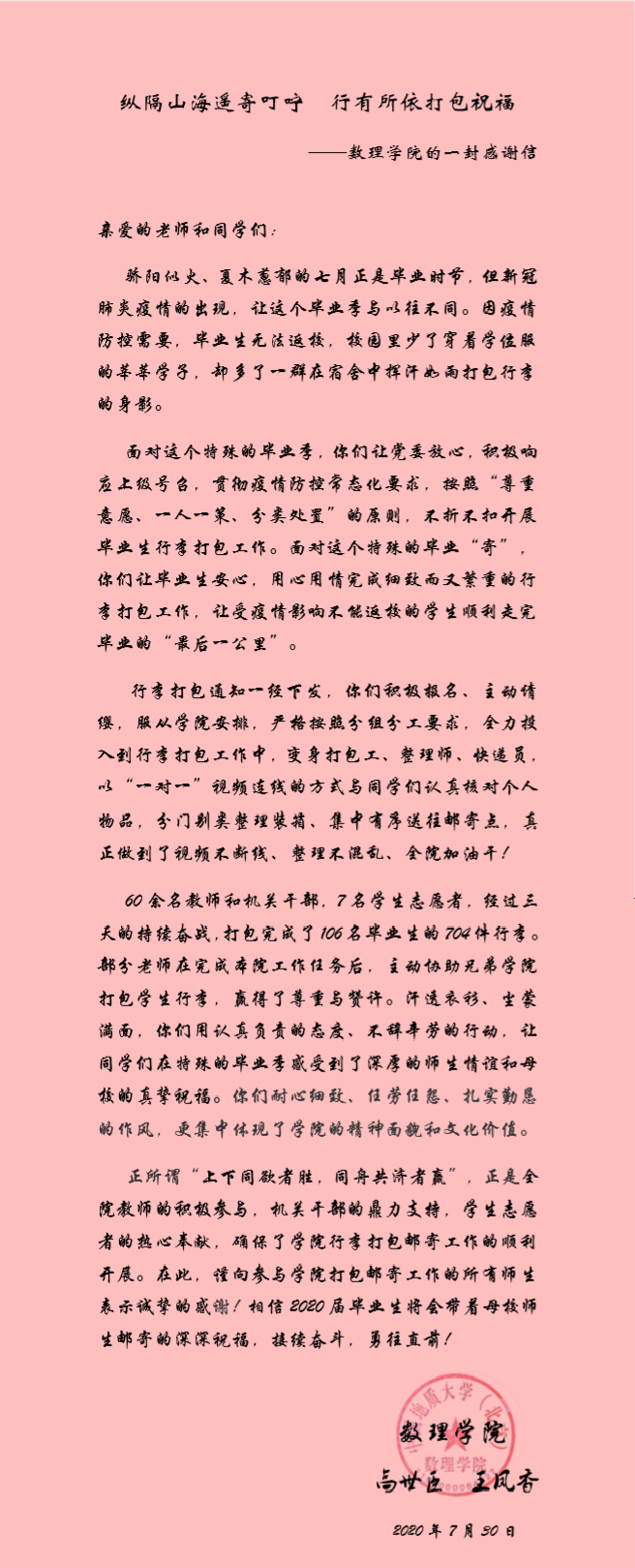纵隔山海遥寄叮咛 行有所依打包祝福——数理学院的一封感谢信