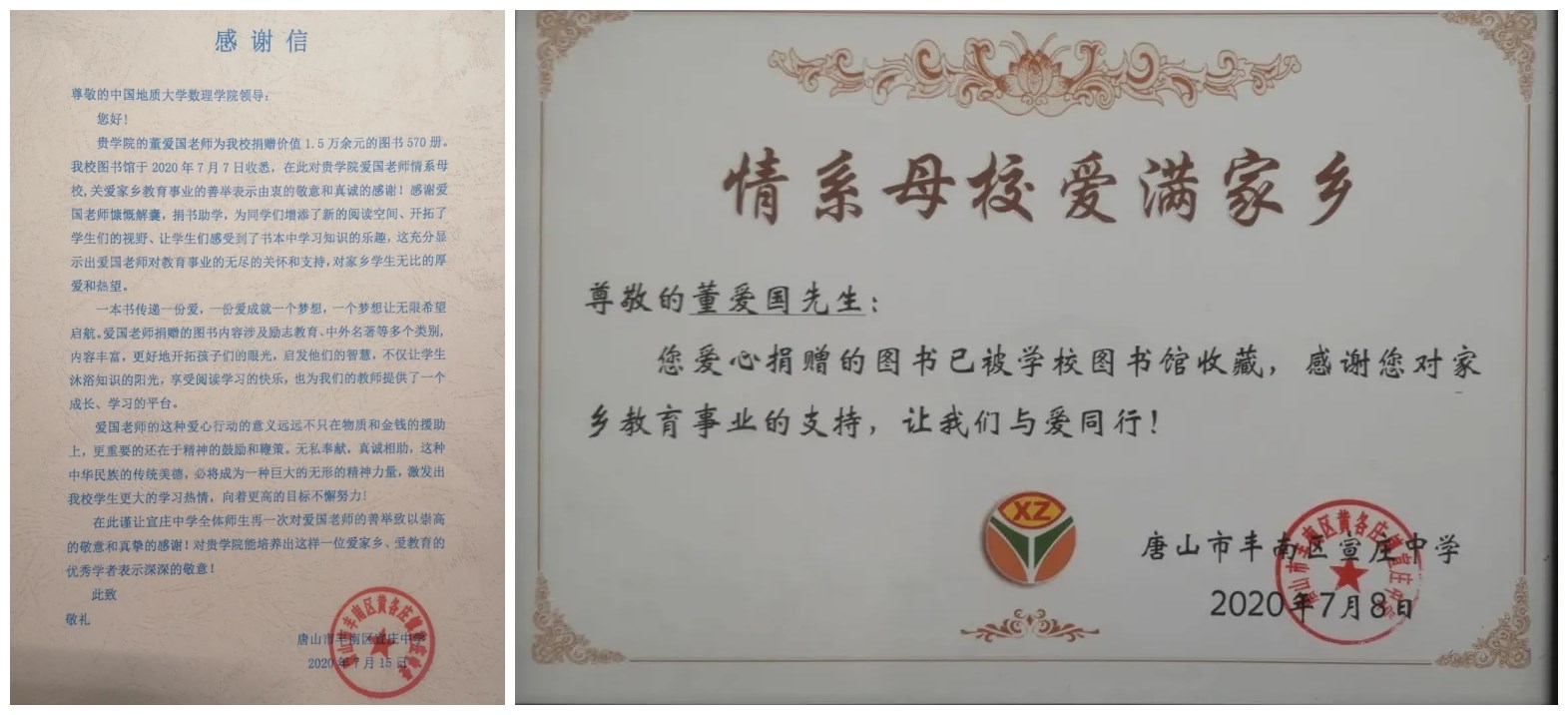 在关注学生成长的同时,董老师也牵挂着偏远地区的孩子。自2010年起,他每年都为贫困地区的孩子们邮寄爱心包裹,赠送学习用品和各类图书,在他办公室的墙上贴着许多受助孩子的回信,他们稚嫩真诚的言语是对董老师公益心的最好见证。今年疫情期间,董老师向青海化隆县知海买小学和母校河北省唐山市宣庄中学分别捐赠图书200册和570册,价值近2万元,并收到了受助学校的感谢信。与此同时,董老师还积极参加由我校毕业生发起的名师讲堂公益行活动,为来自不同地区的20多名小学生网上讲授书画入门课程,丰富孩子们的学习生活。