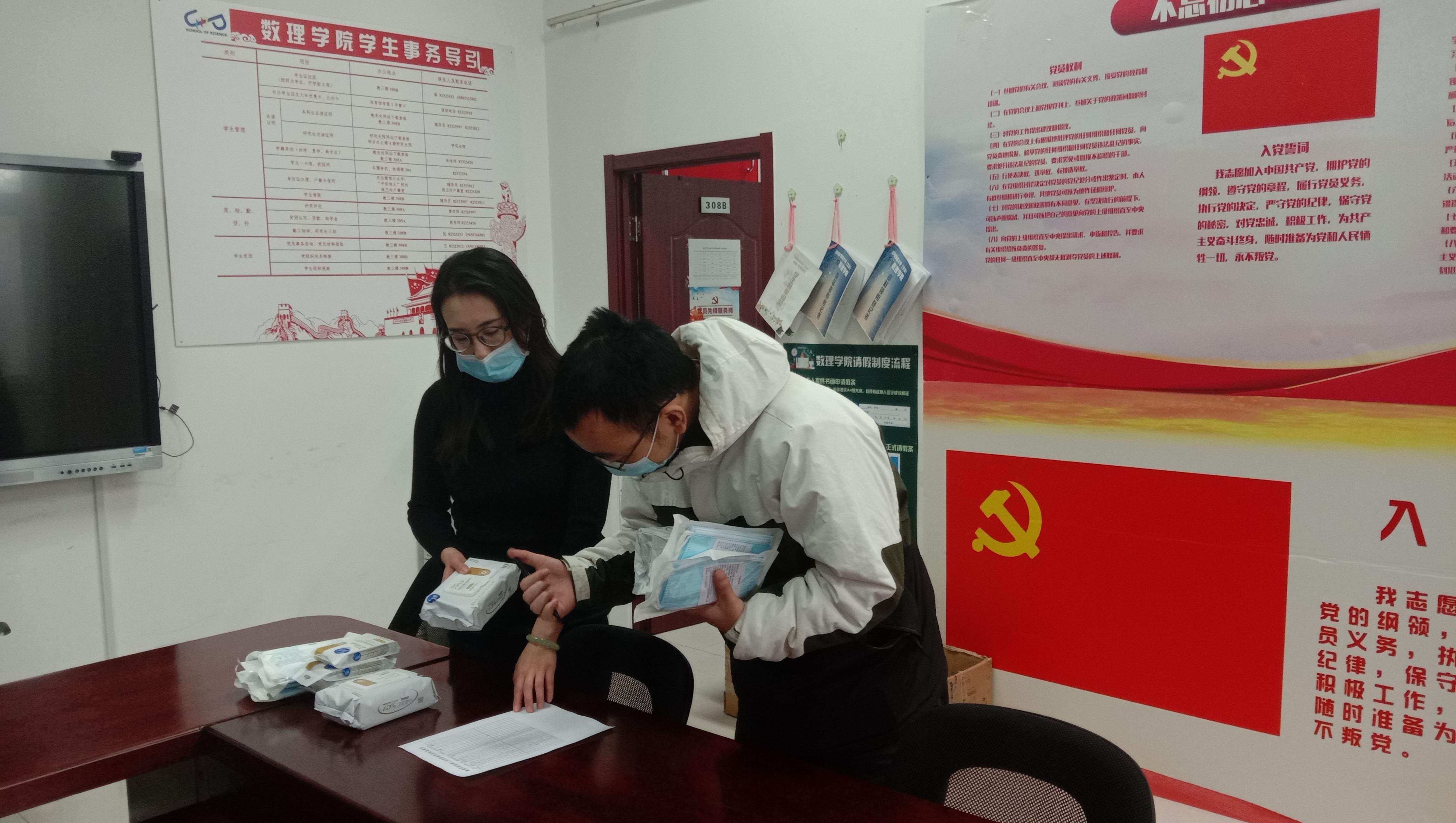 为增强战胜疫情的信心,表达数理学院对寒假留校学生的关怀和关爱,2021年1月13日下午,数理学院党委副书记伊然老师,2018级本科生何志坚同学在教三楼308为留校的24名同学分发防疫物资,让同学们度过一个温暖、安全的寒假。