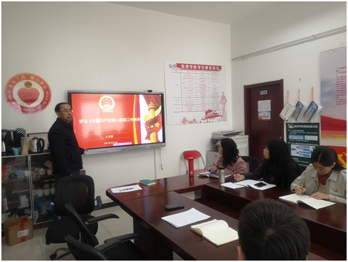4月13日中午,在教三楼308会议室,数理学院党委理论学习中心组专题学习《中国共产党统一战线工作条例》。党委书记王凤香、副书记伊然及学院党委委员、教工党支部书记参与本次学习。