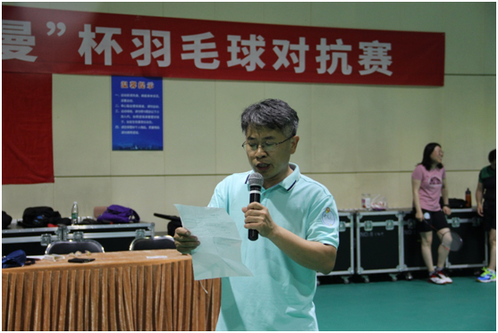 之后总裁判长郑志远老师宣读比赛规则,并宣布“数理曼”杯羽毛球对抗赛正式开始。本次比赛由老师与毕业生组队双打,共有9个小组36支队伍进行比赛。本着“友谊第一,比赛第二”的原则,同学和老师们“打成一片”,进行了一场场畅快淋漓的球赛,在球场上挥洒汗水。