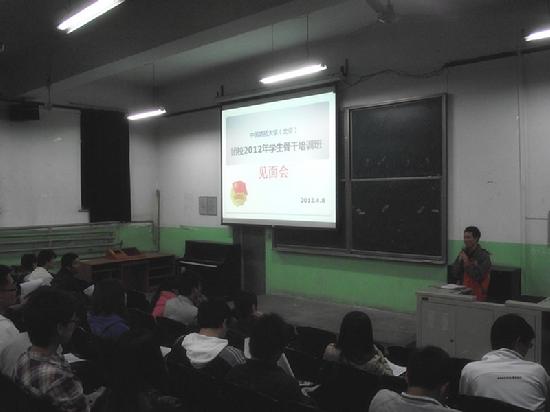 4月8日晚七点,团校2012年学生骨干培训班暨第五期高级团校新学员见面会在教三楼101举行。第五期高级团校全体新学员参加见面会。见面会由校团委组织部副部长裴松伟主持。