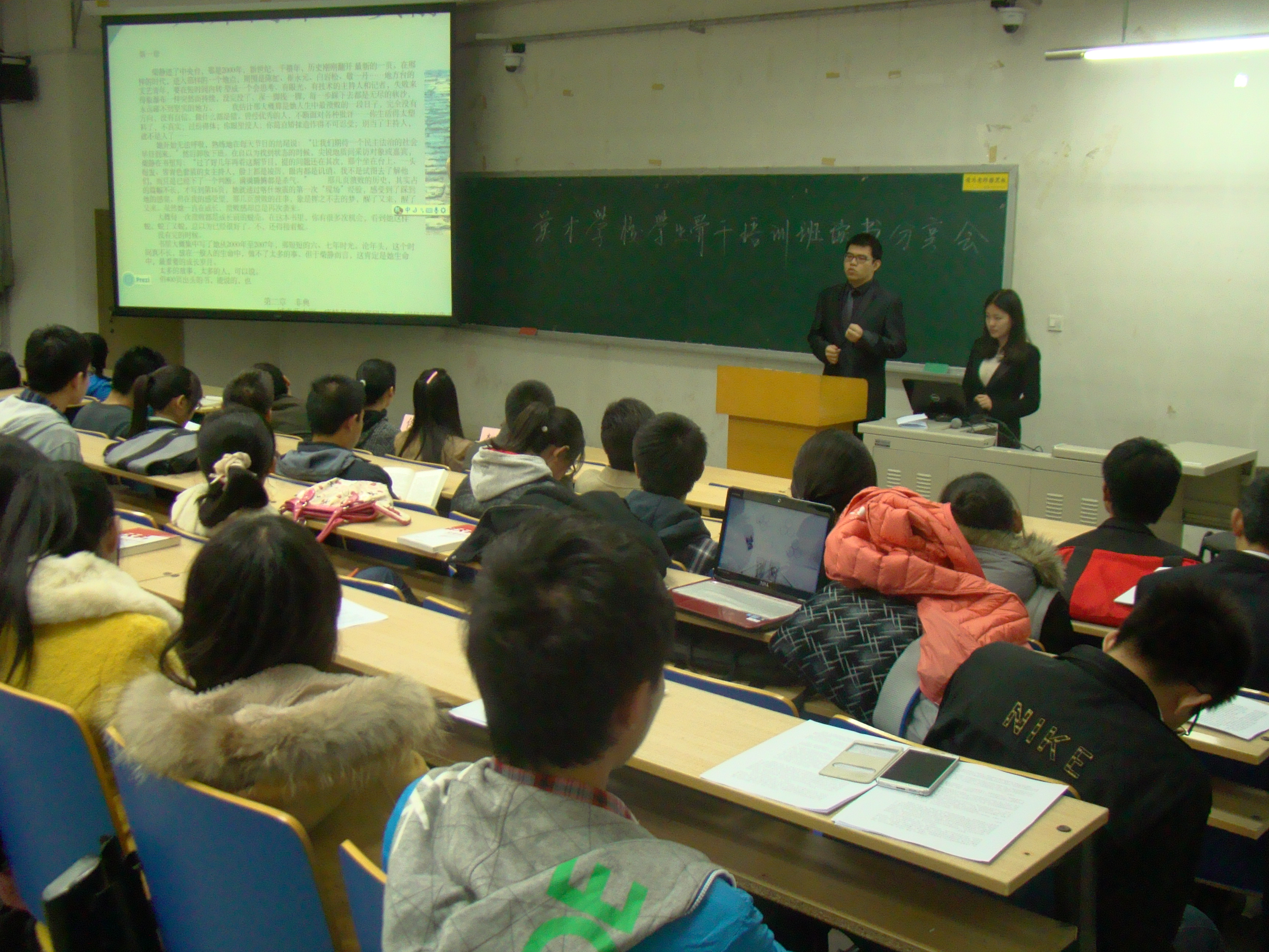 晚上七点读书分享会正式开始。四组学员各派代表上台与大家分享了自己组的读书成果。每一组的学生骨干们都进行了精心的准备,使整个读书分享会生动有趣地进行。四个小组都采用了视频展示的方式向现场给为展示了自己的团队,同时小组成员结合柴静的《看见》、覃彪喜的《读大学,到底读什么》等书籍的书中内容、读书感悟、以及社会现状向大家分享了他们的读书成果。表达了孟子“尽信书,不如无书”这一观点。