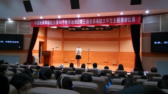 2015年4月23日下午14:00,中国地质学会纪念第46个世界地球日第三届首都高校大学生主题演讲比赛在首都师范大学举行。本次活动由中国地质学会主办,被列为国土资源部第46个世界地球日示范性活动。我校数理学院张梓童同学代表学校参赛,荣获二等奖,我校荣获优秀组织奖。
