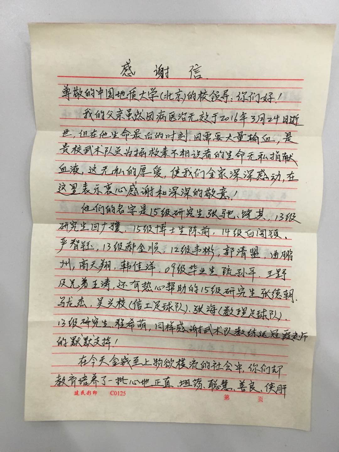 2015年,李雨薇学姐的姥爷重病住院,急需大量输血。高额的医疗费用和不稳定的血液供应让这个脆弱的家庭忧心忡忡。在孤立无助的时候,李雨薇想到了地大武协的兄弟姐妹,并向前会长张弛寻求帮助。武协的成员听说这个消息后都踊跃奉献自己的爱心,在姥爷住院需要输血的24天里,以武协同学为首的地大学子们累计有19名同学进行了献血,不为金钱,不为感谢,只为那一份浓浓的校友情。