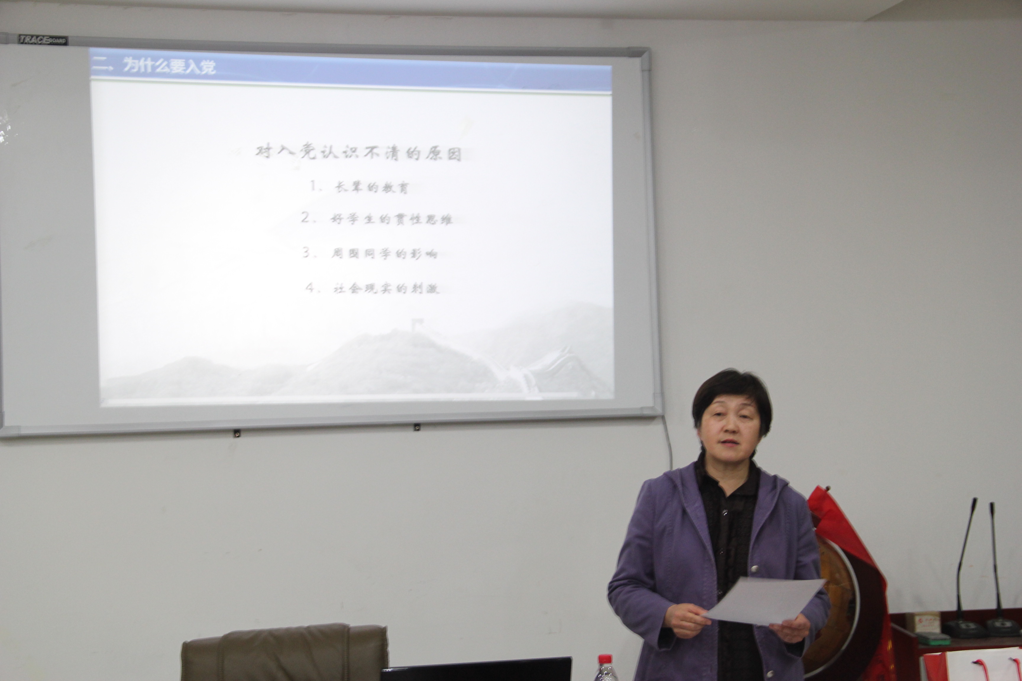 视频播放完毕,黎斯老师首先向各位学员阐述了如何端正入党动机,争做合格党员。接着,她以端正入党动机为切入点,以邓稼先等优秀的共产党员的事迹解释了入党对自己牢固树立正确的世界观、人生观、价值观,对当代大学生的家国情怀的理解都有重要意义。在谈及争做合格党员时,黎斯老师围绕“正确认识党员标准”、“接受党组织培养”、“积极创造成为合格党员的自身条件”等方面对如何以实际行动向党组织靠拢的问题进行精彩独特解读。黎斯老师深刻独到的见解,感染着现场每位同学,最后她希望同学们能够把本节课的学习落实到自己的学习生活中去。