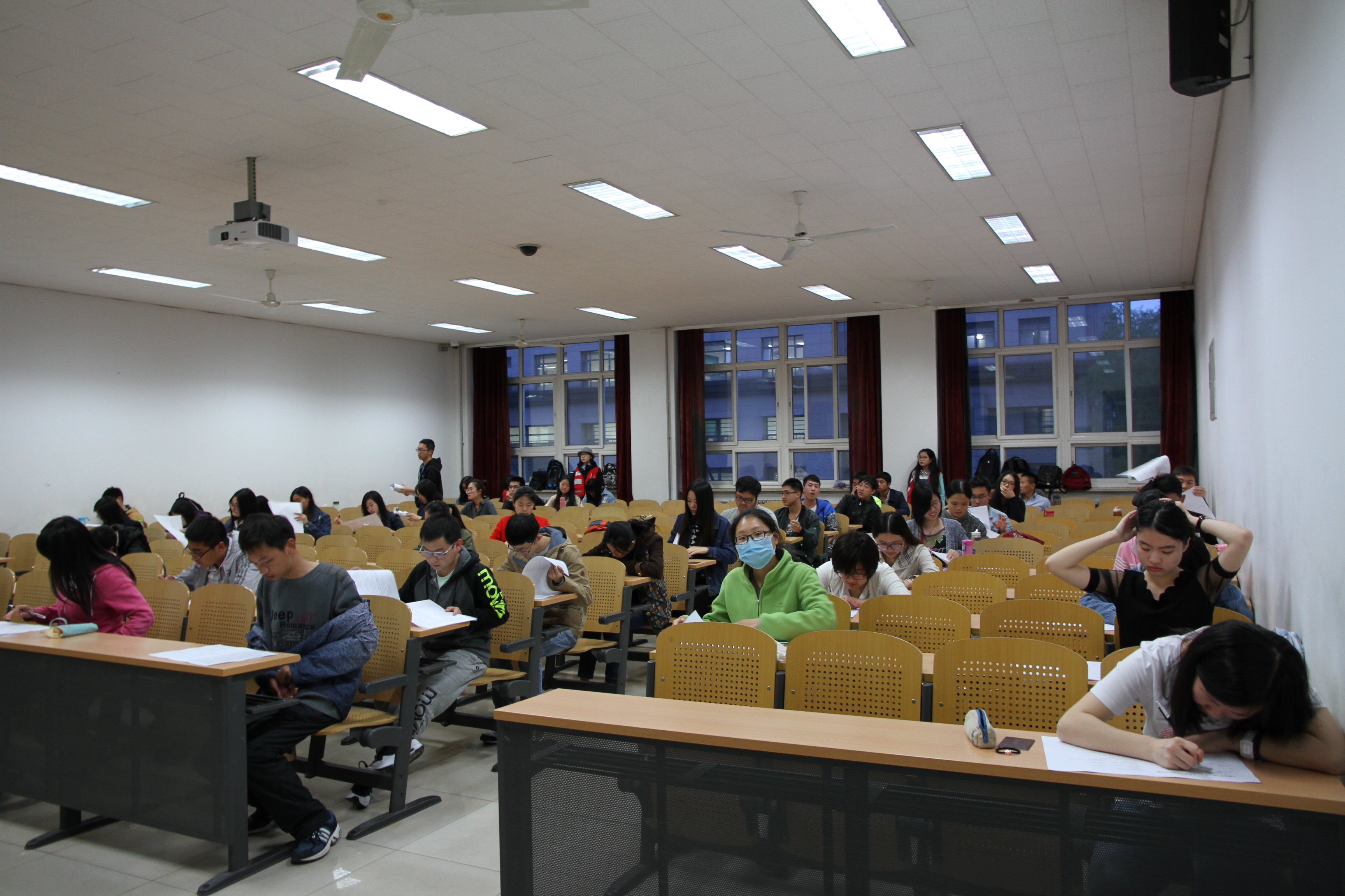 晚7点整,考试正式开始,同学们认真答题,遵守考场规则,展现了地大学子的良好考风,穿着印有红十字标志衣服的监考人员也各尽其责,严肃考风,总考监也督察了相应的考场。