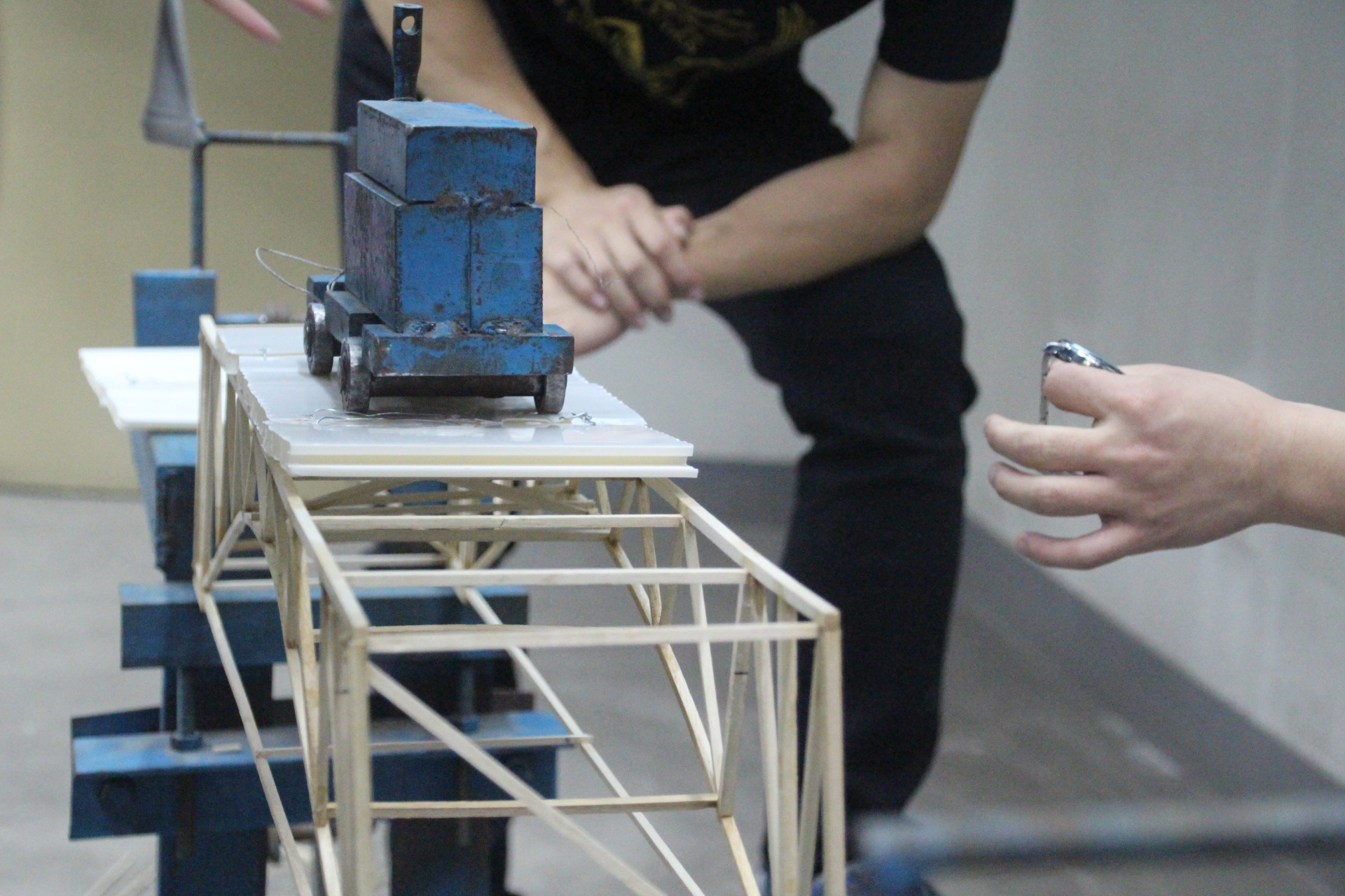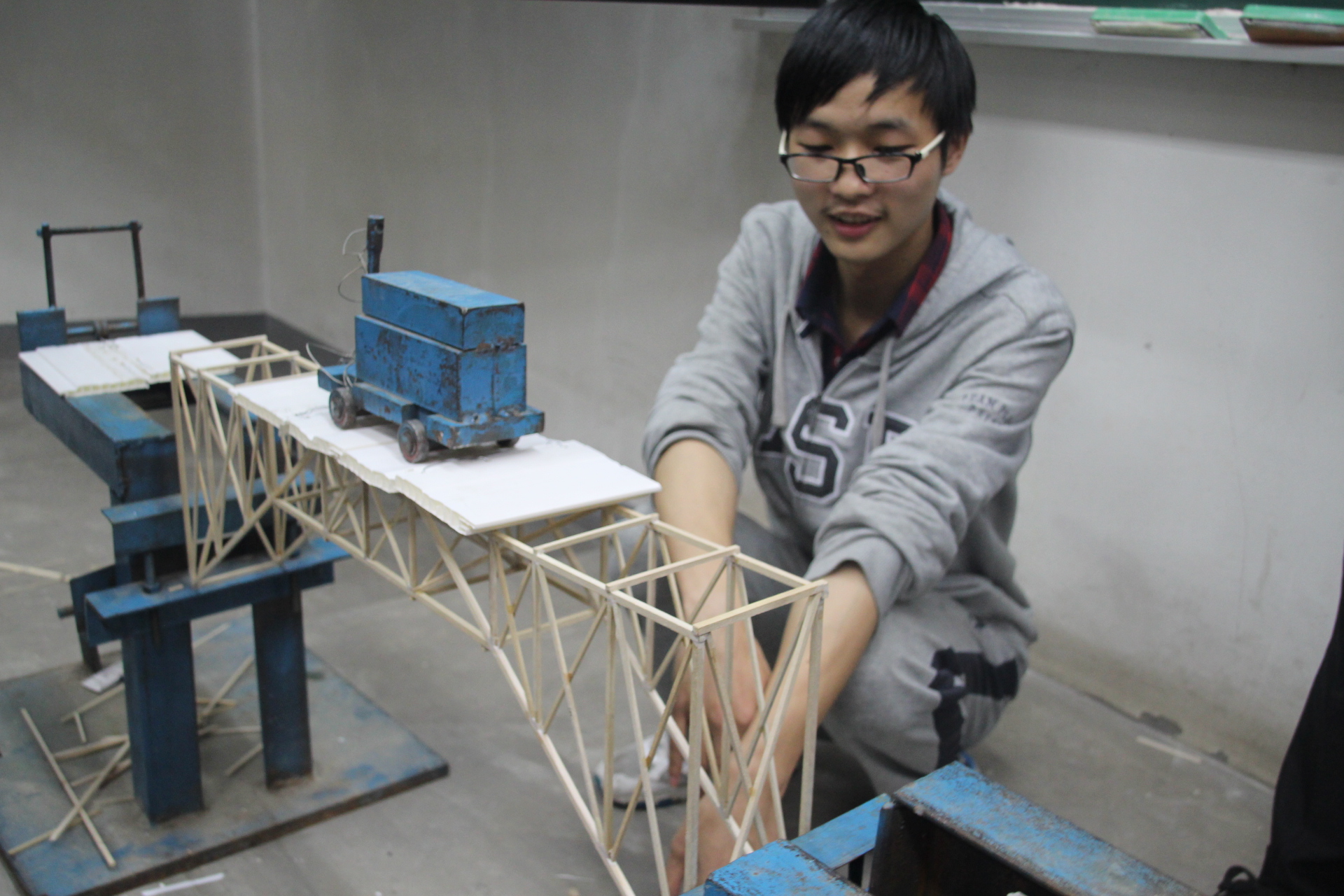 本次结构设计大赛分为A组和B组两个小组,其中A组赛题是桥梁模型制作,B组是缩小版风力发电塔架结构设计。比赛过程中,两组赛题同时进行了承重测试,A组桥梁模型承重15公斤的小车模型,B组风力发电塔架结构承重25公斤的模型。小车静载只是比赛的第一步,经受住小车“考验”的桥还要通过“造型”、“结构设计”等多方面的考察和选拔才能通过初赛。经过一个半小时令人紧张无比的测试后,现场工作人员统计出了通过初赛的小组的名单。