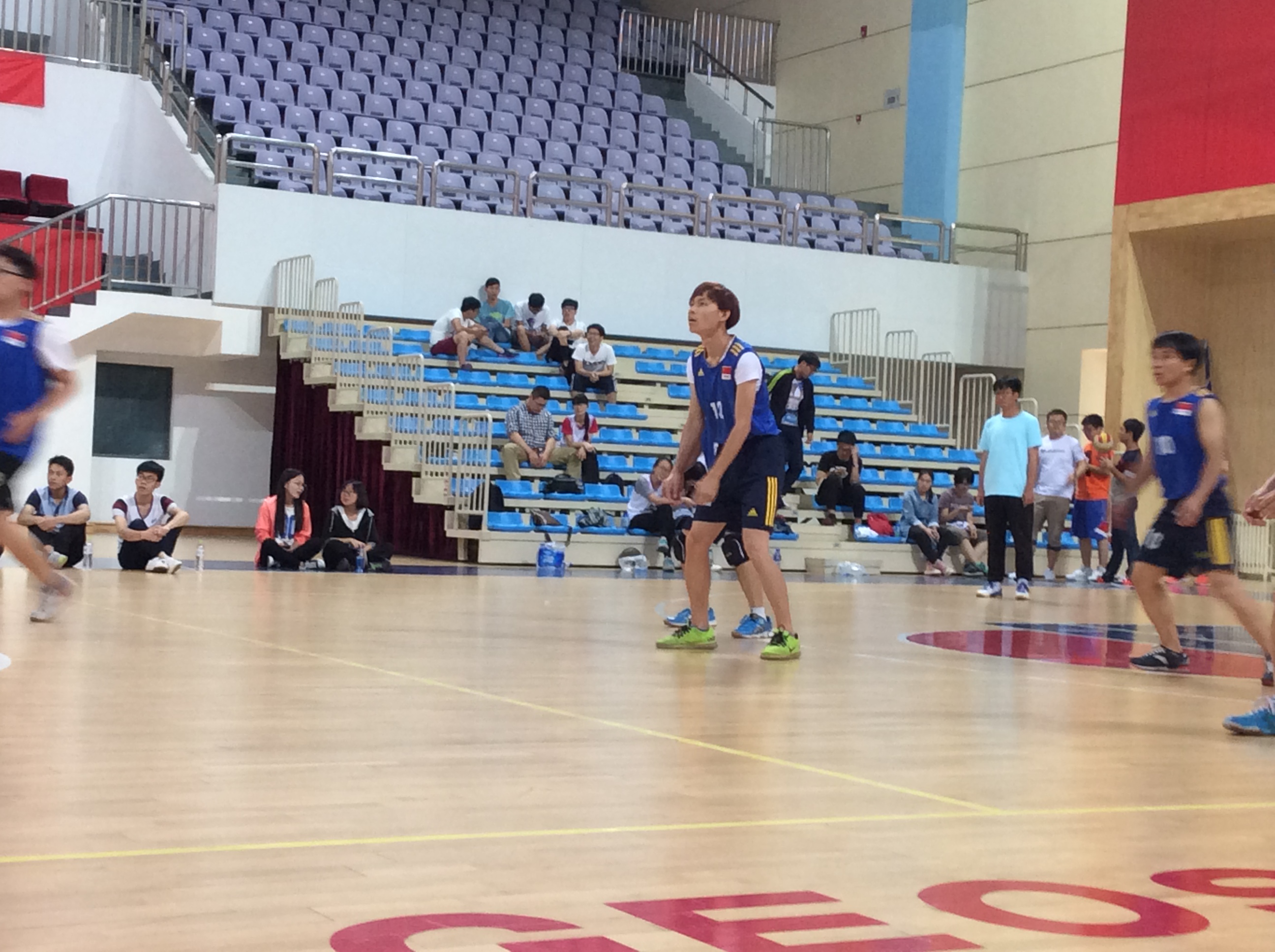 午时,体育馆篮球场人声鼎沸。校排球队为活跃比赛气氛和增加比赛的趣味性和观赏性,于正式比赛之前,进行一场精彩的表演赛。精彩的表演赢得阵阵喝彩声。