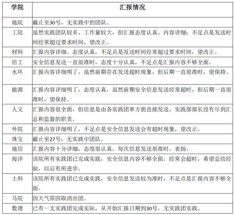 地信、能源两个学院上报工作完成质量高,反馈及时,而人文(没有汇总)、土科(内容很不全面)、海洋(超时次数多)上报情况完成度相对较差,请各学院团总支副书记加以重视。在八月份的工作过程中进行调整和改进。