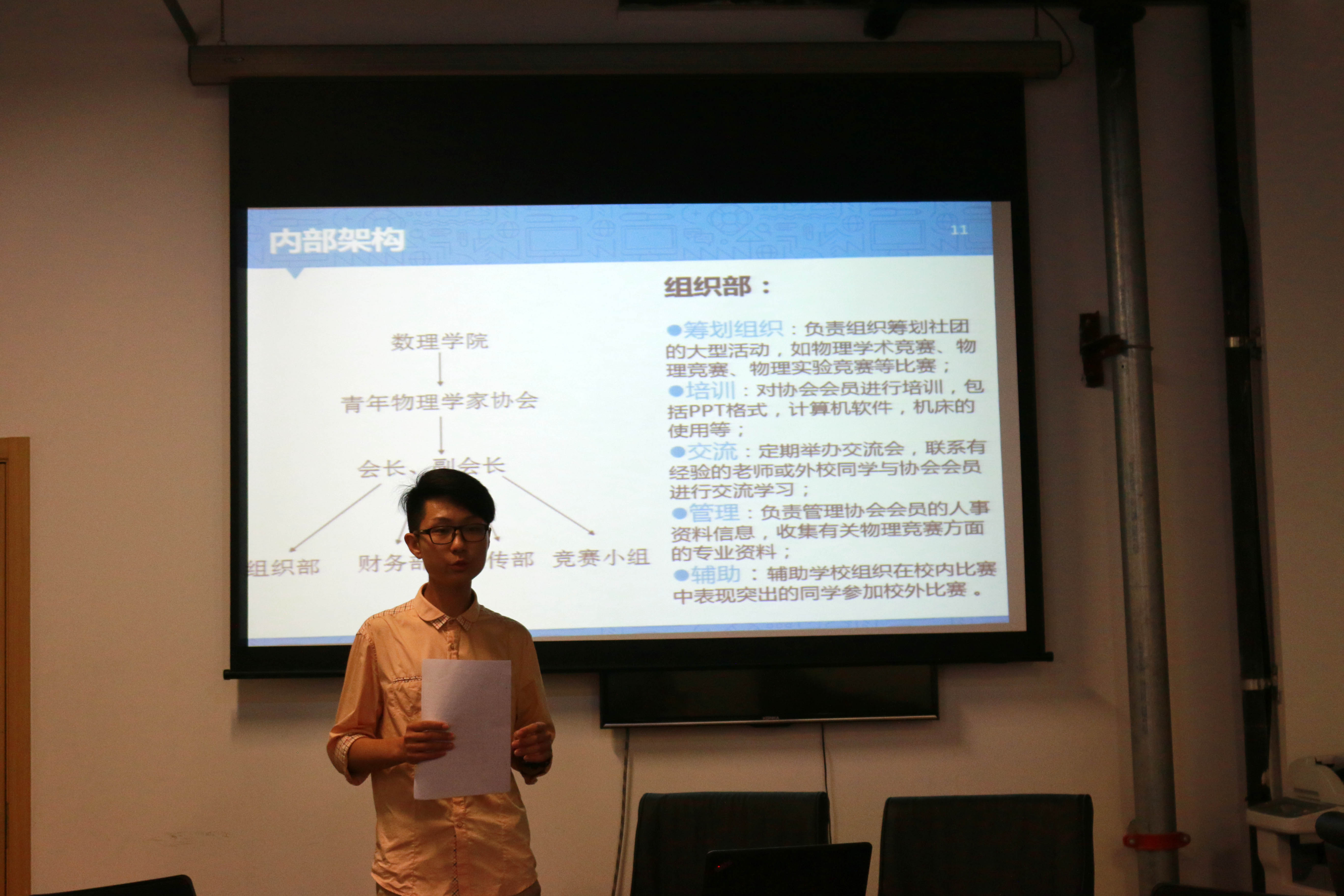 2016年9月18日14时,2016年秋季学期新社团成立答辩会在体育馆203会议室举行,社联秘书长李宗慧老师,社联主席团、部长团作为评审团出席了本次答辩。军事爱好者协会、烟火数媒社、青年物理学家协会、地大创客协会、自然科学爱好者协会等五个社团参加了此次答辩。