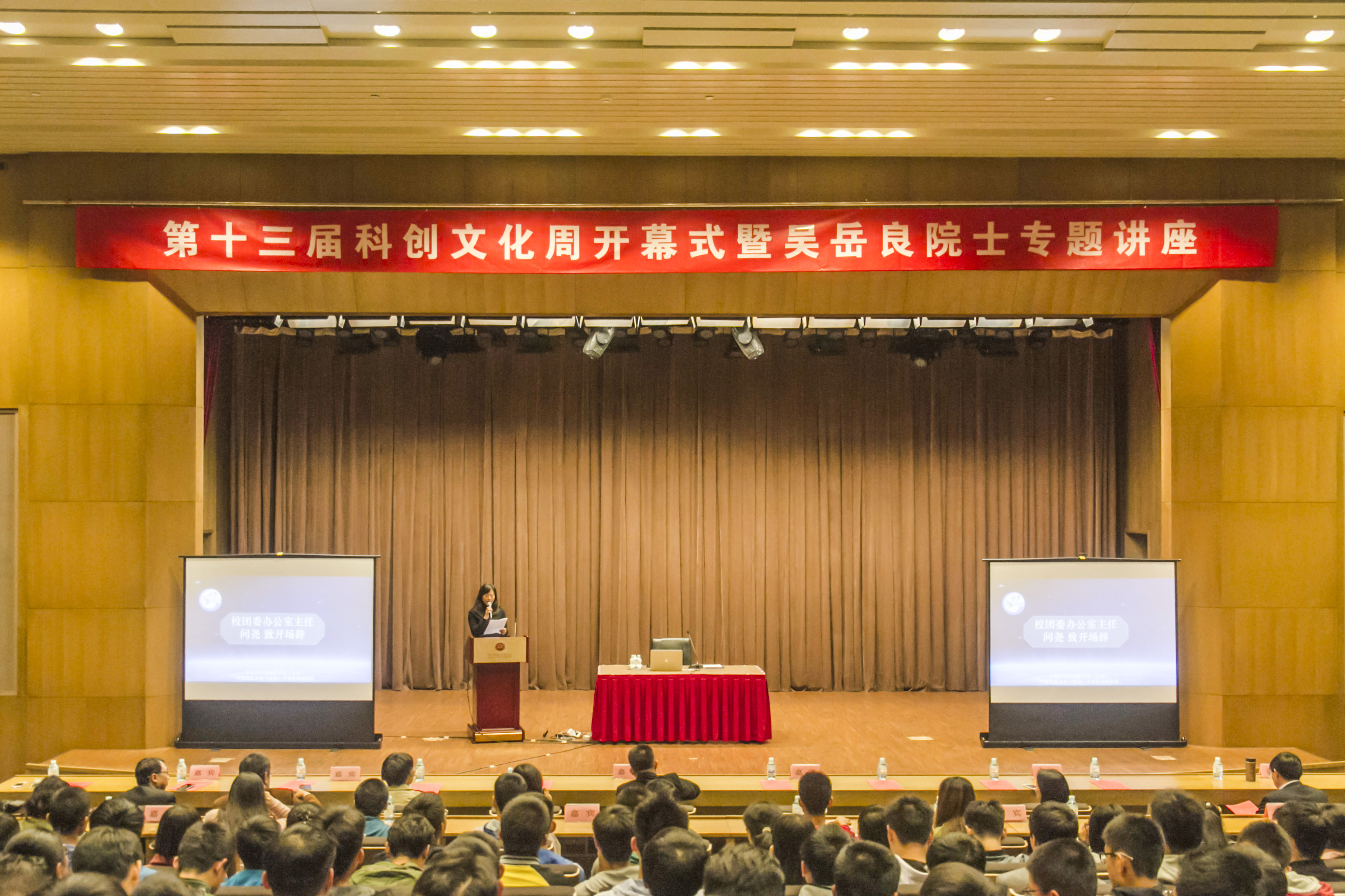 2016年10月21日晚7点,中国地质大学第十三届科创文化周开幕式暨吴岳良院士专题讲座在地大国际会议中心南楼二层报告厅隆重举行。中国科学院院士、中国引力波探测计划“太极计划”首席科学家、中国科学院大学副校长、著名理论物理学家吴岳良,北京市科学技术协会信息中心主任张晓芸,校团委办公室主任问尧莅临本次开幕式。北京各高校学生科协代表及我校师生共700余人参加了此次开幕式。