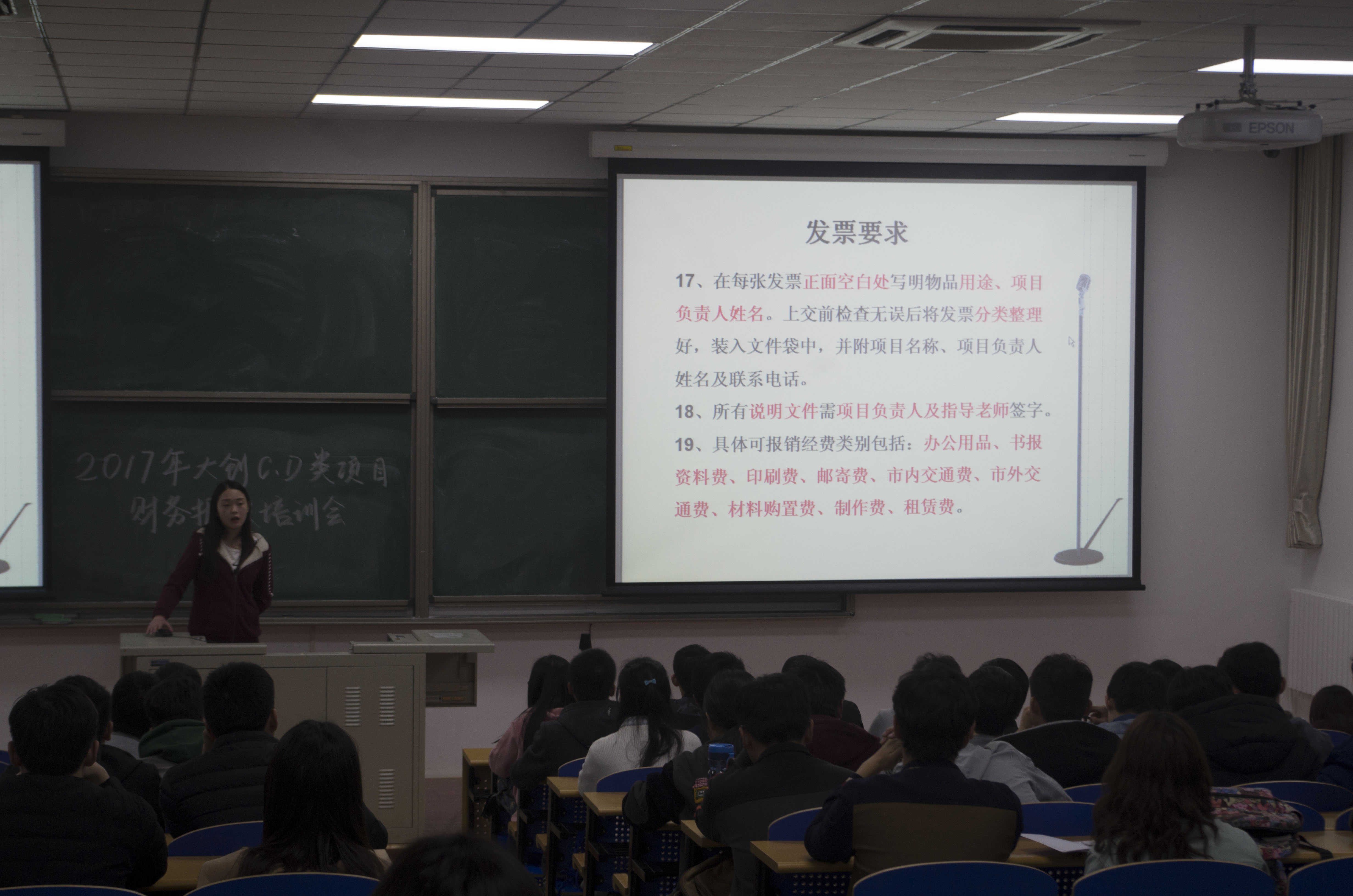 3月3日晚七点,2017年大学生创新创业训练计划C、D类项目财务报账培训会在教三楼101举行。本次培训会由校团委课外科技指导中心财务负责人马泽主讲。