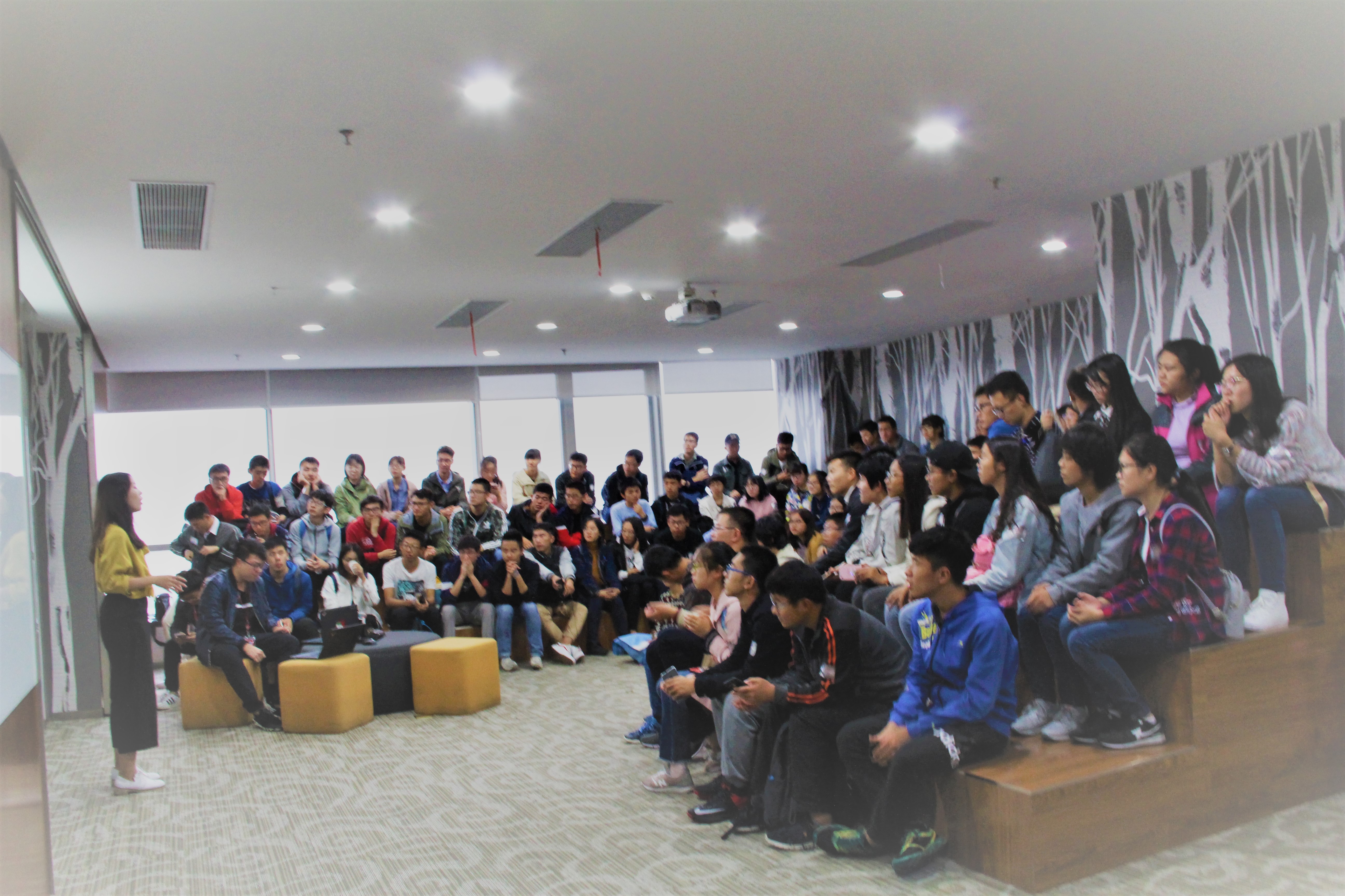 游戏结束,由于人数较多,科技协会负责人将同学们分成两组,在京东工作人员的带领下先后进行了企业参观和京东职位应聘笔试体验。参观过程中,工位、医务室、健身房、餐厅等区域设施之完善让同学们直呼羡慕。最后,在一声声赞叹声中,此次参观学习到此结束。
