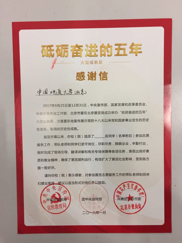 近日,中宣部宣教局、团中央宣传部以及共青团北京市委向我校2017年“砥砺奋进的五年”大型成就展志愿活动19名志愿者发来感谢信,充分肯定了我校志愿者对本次活动的突出贡献,高度赞扬了我校志愿者在本次志愿服务中的优良作风。