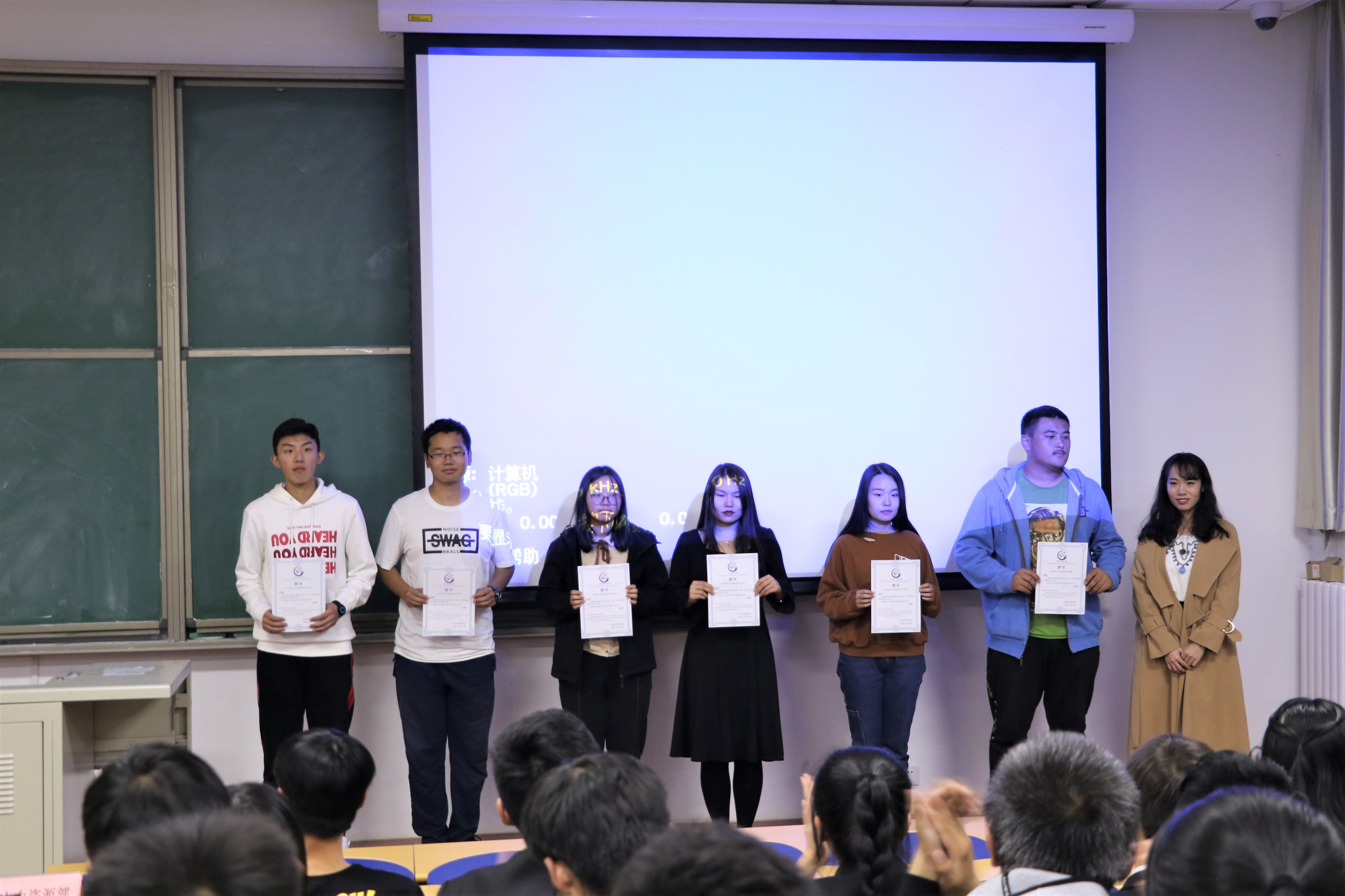 首先,主持人对科协过去一年的工作进行了简单的回顾,包括脑洞大开的科创文化节、获益匪浅的赵鹏大院士讲座、奇妙的京东之旅、有趣的科协内部趣味运动会等等,这些活动在科协各部门的共同努力下取得了丰硕的成果。紧接着便是各部门的工作总结和风采展示,各部门代表都积极的将自己部门的职能和特点介绍给其他部门的同学们,在喜迎科协新生见面会的视频中,大一新干事们又以富有欢乐气息的节目表演作为献给科协大家庭的礼物。从几个代表的介绍中,看得出各个部门为过去一学年科协工作的顺利开展都付出了很多努力。然后罗宇航主席又再一次向大一新生介绍科协并对科协新鲜血液表示热烈的欢迎。当然,他也对大二的干事们提出来更高的要求,希望他们在新的学年拥有新的追求和新的视野。紧接着,校团委课外科技指导中心副主任孟玲羽为各部门新成员颁发了聘书,这标志着新一代大学生科技协会干事团体正式形成。