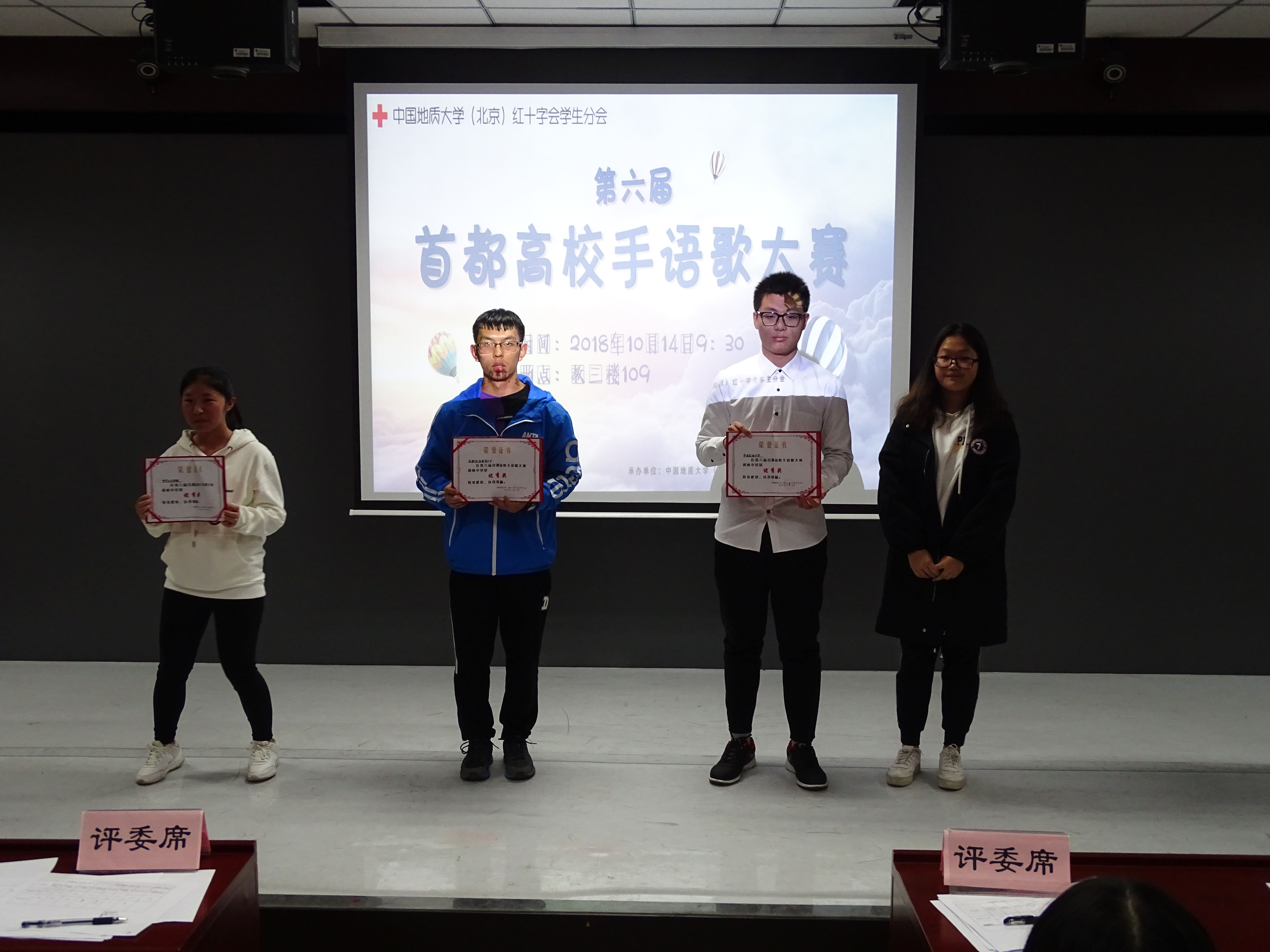 10月14日,由北京市红十字会主办,中国地质大学(北京)红十字会学生分会承办的第六届首都高校手语歌大赛初赛于教三楼109成功举办。大赛邀请到的评委有北京市红十字会刘春达老师,北京语言大学手语社社长肖皓文,中国地质大学李言、宋彦柏、陈雯静、杨扬。参加比赛的六支高校队伍分别是:中华女子学院、中国石油大学、首都经济贸易大学、北京体育大学、北京联合大学、北京林业大学。
