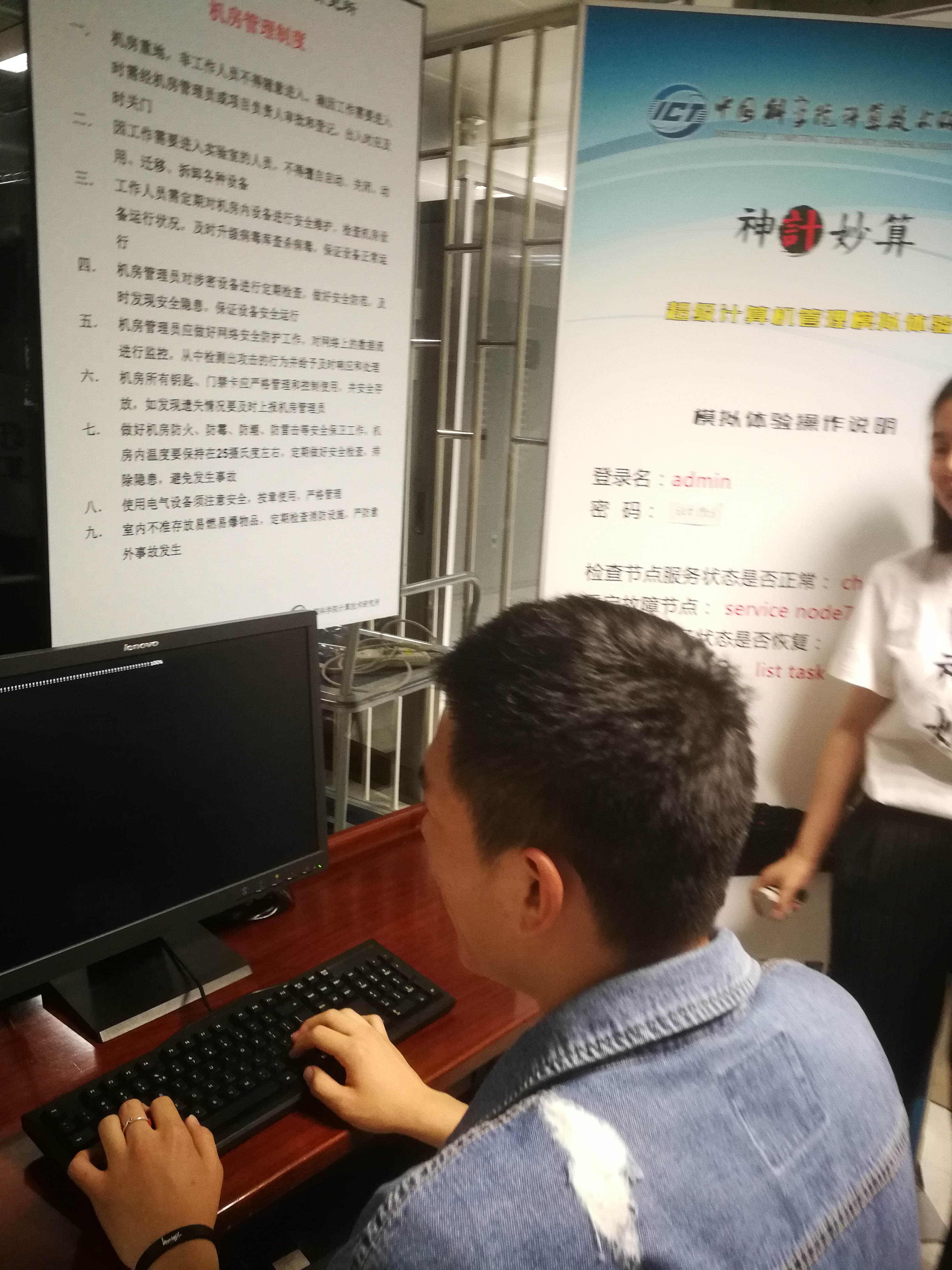 一楼展厅的展品包罗万象,有基于大数据分析的网络舆论分析系统,有基于移动计算的跟随小车,有基于智能信息处理的人脸测心率技术......全是最前沿的科技成果,让同学们大开眼界。二楼的主题是“计算的脚步”,记录了我国计算机由无到有、由落后走向世界顶尖的伟大历史进程。四楼的主题是计算机启蒙和动手练,在这里,同学们与计算机控制的机器人下围棋,还体验设计并且拼接了个性化的控制系统。六楼展厅的内容是芯片专题展,在这里有专门的参与研发的研究员为同学们讲解制造芯片的工艺步骤以及原理操作,并且展示了计算所的最新研究成果——“龙芯”芯片。十层是超机计算机模拟体验活动,在这里,同学们近距离接触超级计算机并通过它试运行了一个小程序。观看展览的同时我们也没有忘记参与相应的小游戏,很快我们就完成了印章收集和宝箱任务,如愿以偿的拿到了纪念品。下午两点,参观结束,同学们顺利完成了场内印章收集和宝箱任务,乘车返回学校。