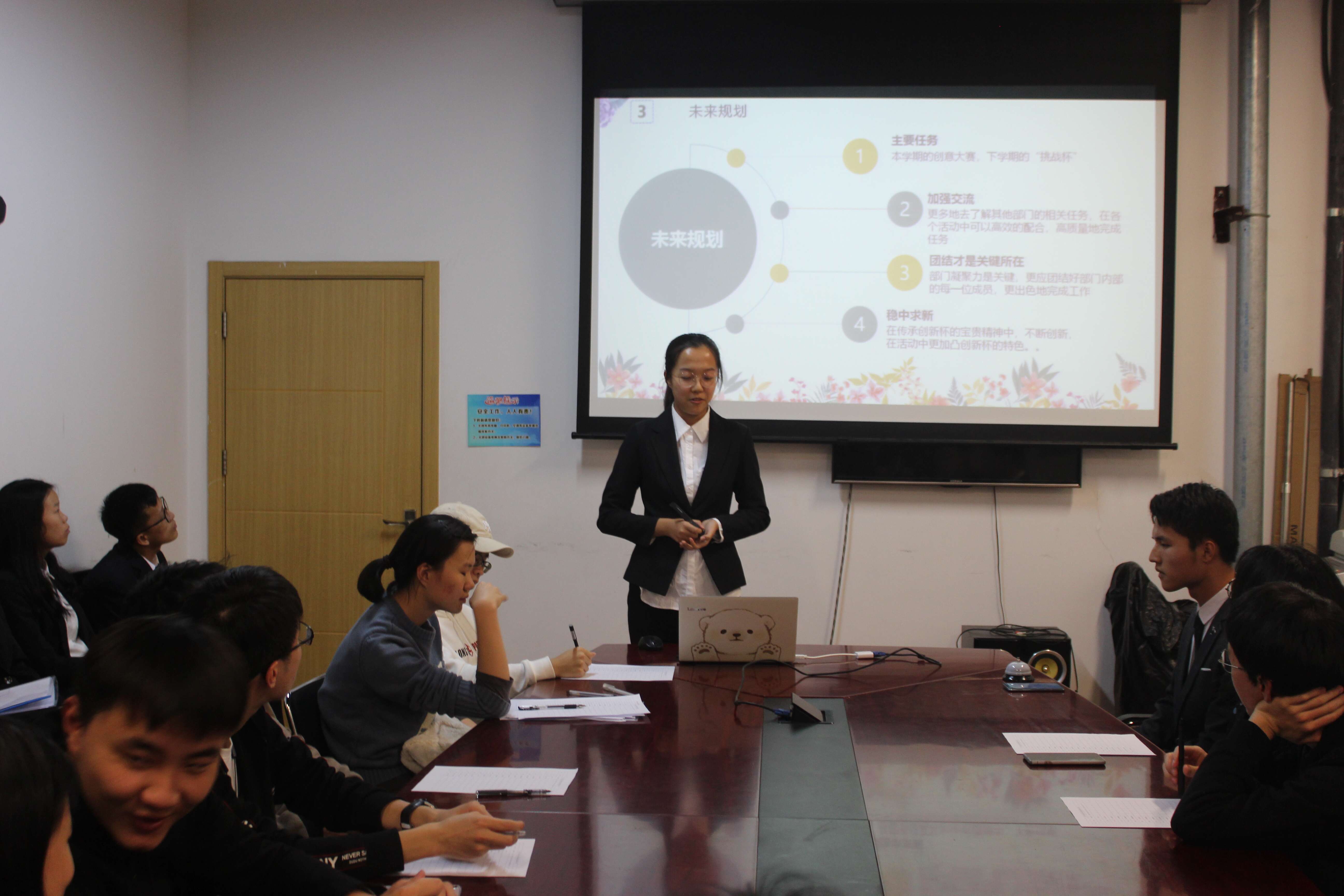 2019年11月7日19:00,第十九届大学生科技协会部长团换届答辩会在体育馆203准时召开。大学生科技指导中心主任孟玲羽、副主任蒋涛涛,大学生科技协会现任主席团黄虹、韩子玉以及第十八届部长团部分成员出席了本次答辩大会并担任评委。