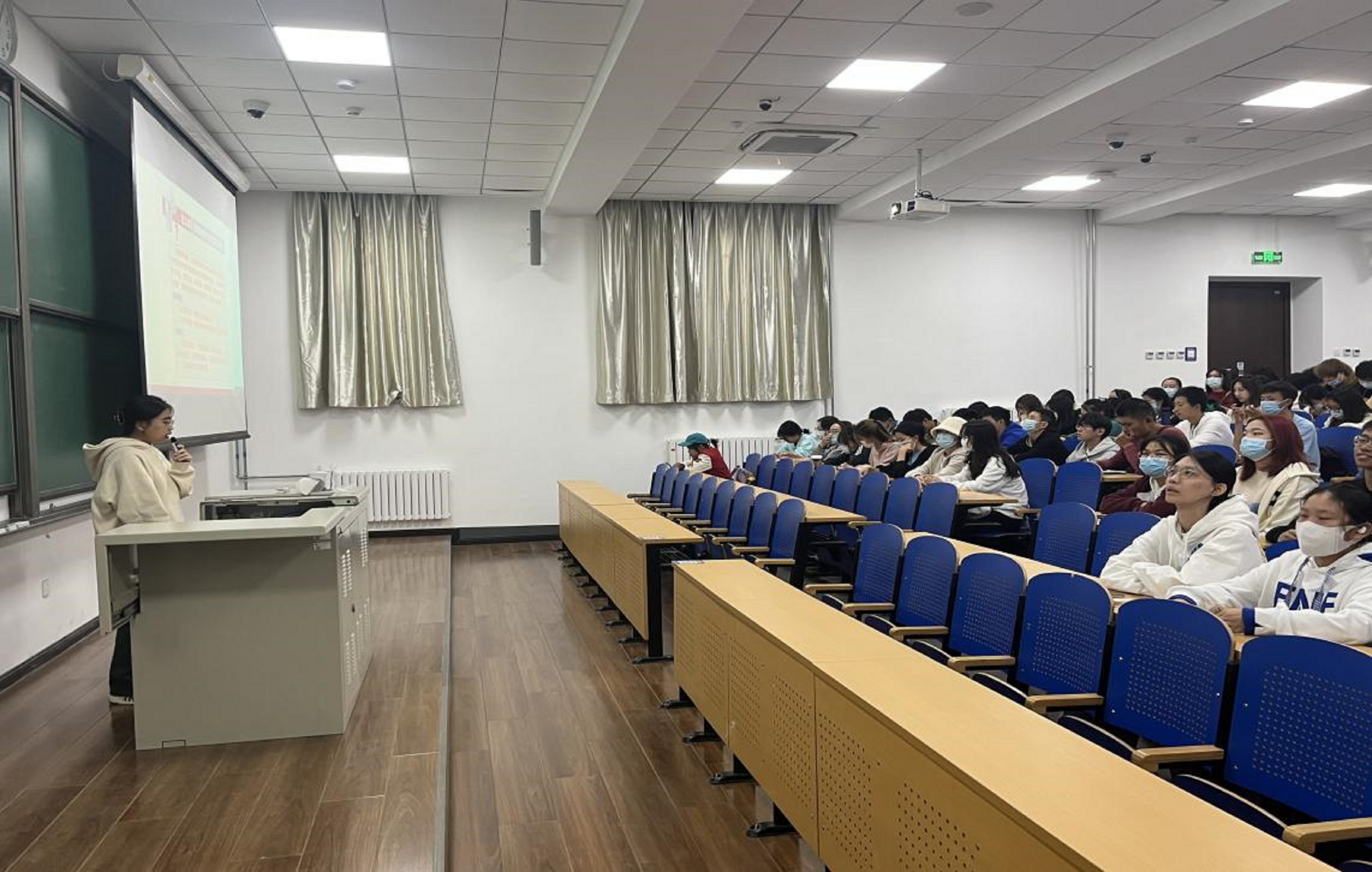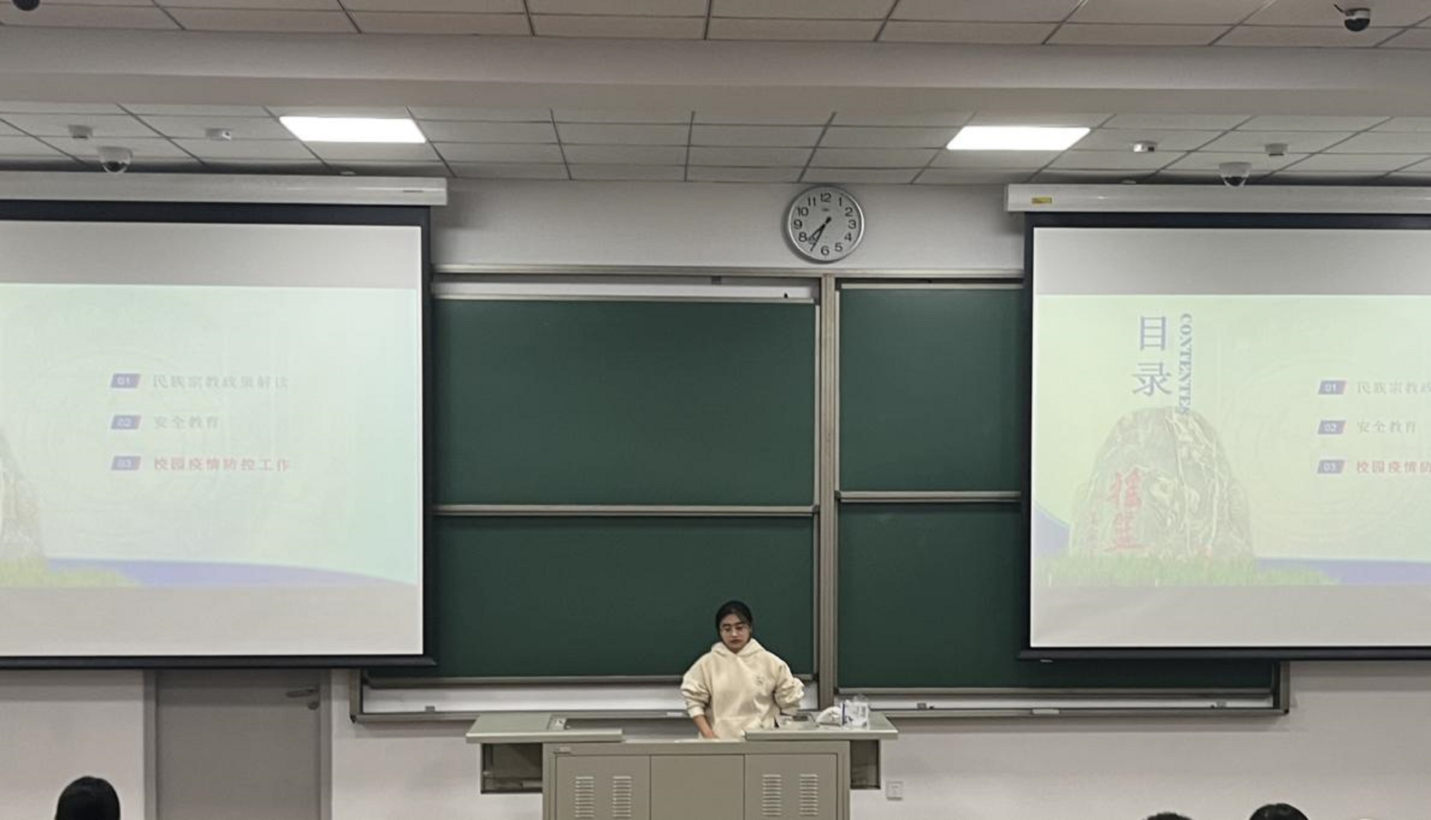 最后,刘老师为同学们讲解了校园疫情防控的具体要求:每日健康打卡;审批出入学校,当日23点前返校;规范佩戴口罩;三天一次核酸检测并进行上报。刘老师向同学们指出不符合学校防疫规定的后果,并多次强调疫情防控容不得半点马虎。