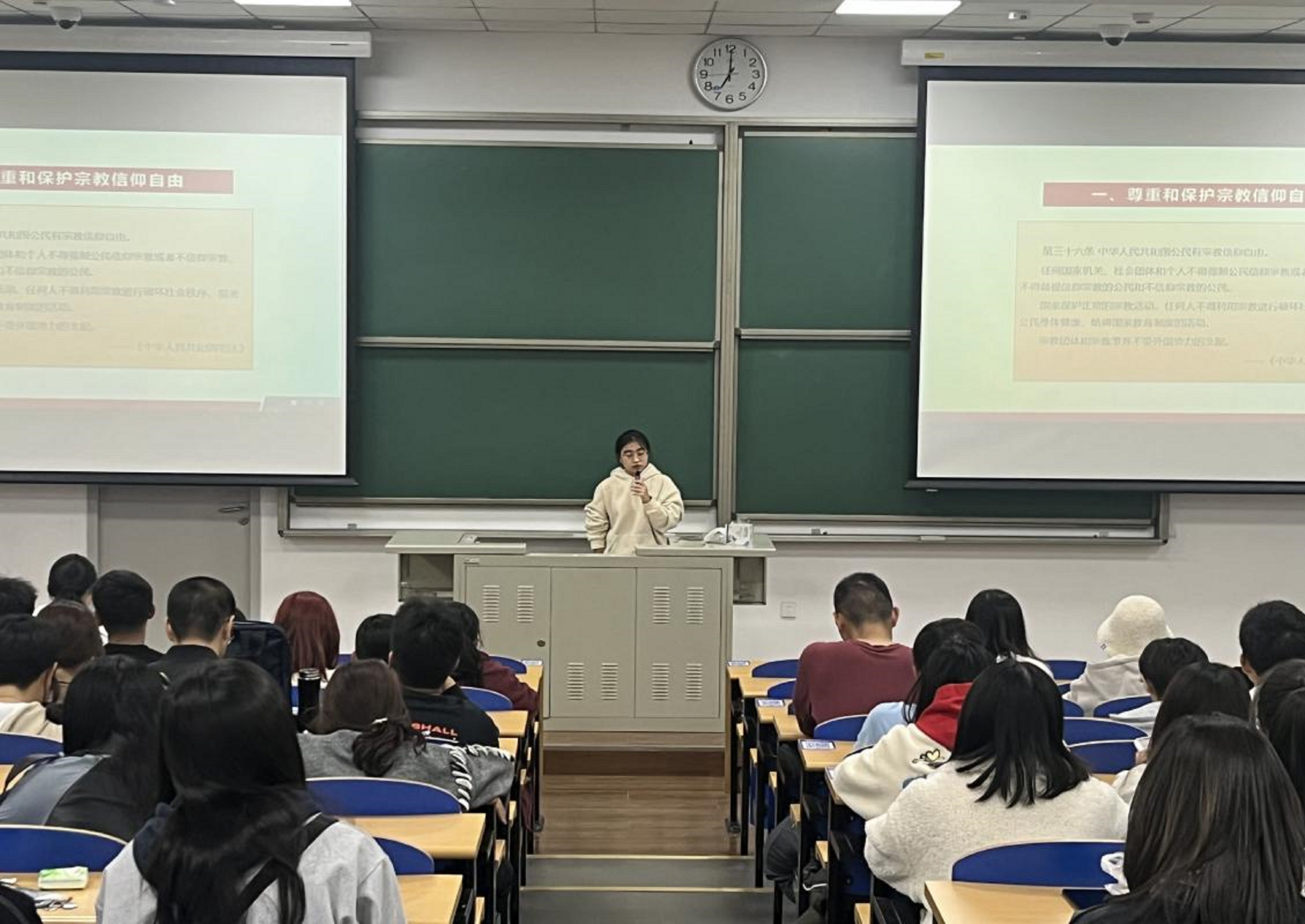 首先,刘一琳老师向大家进行了民族宗教政策的解读,并要求学生尊重和保护民族信仰自由,爱国守法促进民族和谐。告诫学生要保护正常的宗教活动,任何人不得利用宗教进行破坏社会秩序、损害公民身体健康、妨碍国家教育制度的活动,教导同学如何区分正常与非法的宗教活动。