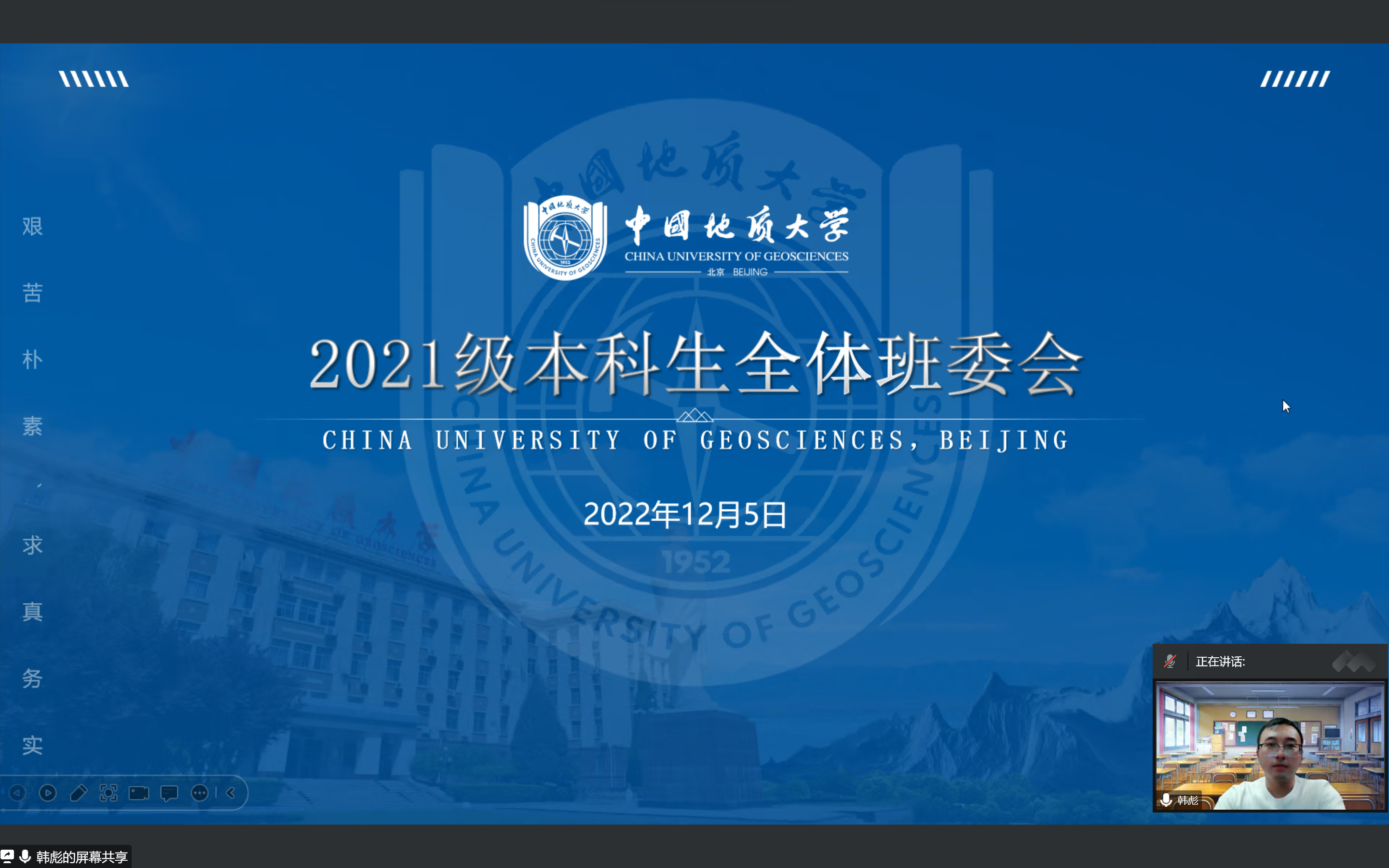 为营造良好班级氛围,加强优良班风建设,提升班委在班级学风建设管理当中的重要作用。12月5日21时30分,材料科学与工程学院线上举行2021级本科生班委会,会议由辅导员韩彪老师主持,2021级全体本科生班委参加。