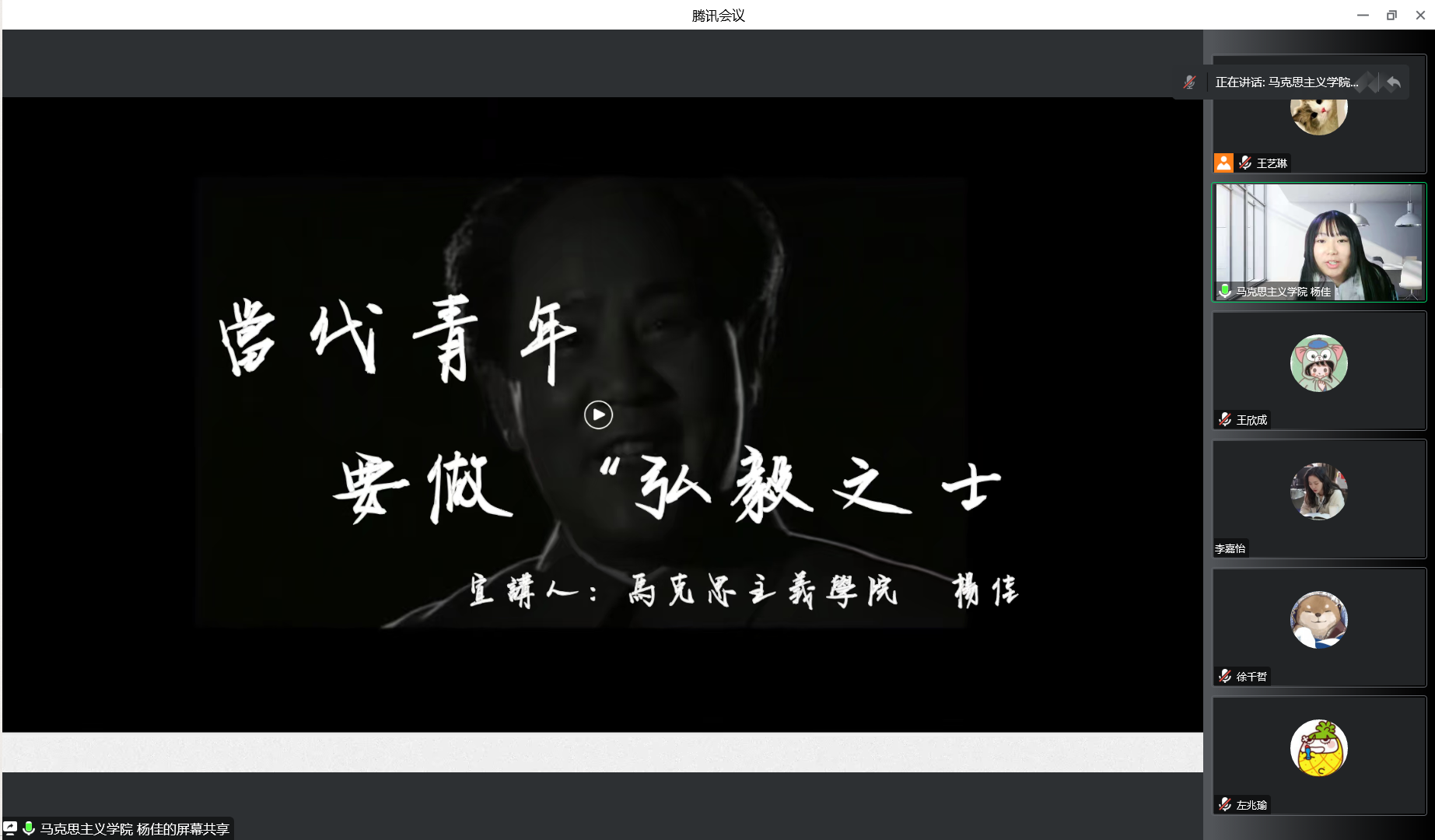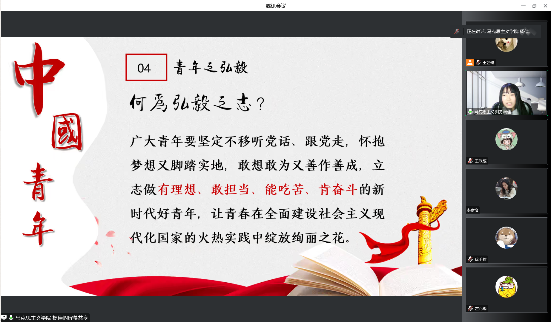 青春献礼二十大,奋进担当向未来。为深入学习宣传贯彻党的二十大精神,团结引领广大青少年紧跟党奋进新征程,坚定理想信念胸怀报国之志,材料科学与工程学院2021级本科生于12月13日下午14时在腾讯会议开展当代青年要做“弘毅”之士宣讲,此次活动由马克思主义学院杨佳进行宣讲。