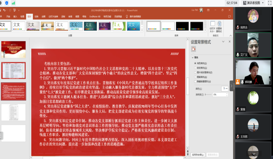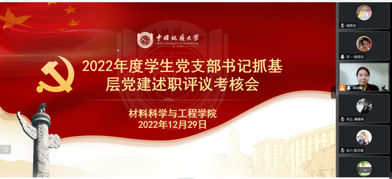 为深入学习贯彻习近平新时代中国特色社会主义思想和党的二十大精神,落实基层党建工作,推动基层党建与中心工作深度融合,并根据我校《关于做好2022年度高校党组织书记抓基层党建述职评议考核工作的通知》,2022年12月29日下午3点,材料科学与工程学院于线上召开2022年度学生党支部书记抓基层党建述职评议大会。学院党委书记周富强,党委副书记、学工组长余茹,保卫部(处)副处长、学工组长助理艾广义,学院全体辅导员老师以及全体学生党支部书记参会。本次会议由学生党建工作负责人郭利娜主持。