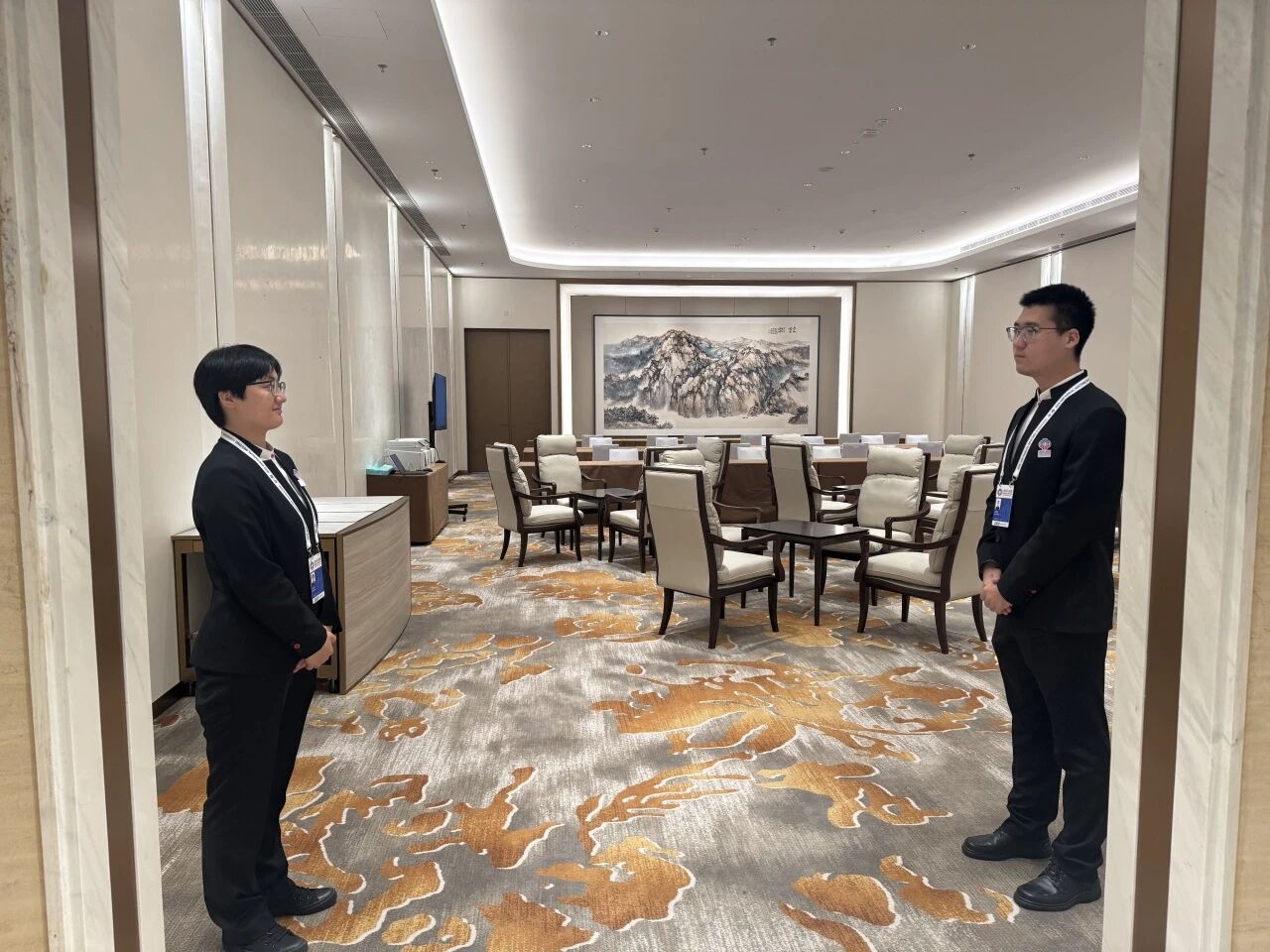 其中,理事休息区志愿者在专属休息区域协助中英双语沟通,保障会场与休息区的协调衔接,时刻关注并监管休息区用品的补给、茶歇的供应;餐饮及茶歇区志愿者在会场各处餐饮茶歇点位统筹监管区域内餐饮的补给、茶歇的摆放与场地的清洁;交流区志愿者在活动交流专属区域协助中英双语沟通,保障会场环节衔接顺畅,同时监管办公用具的完好、茶歇的及时补给。