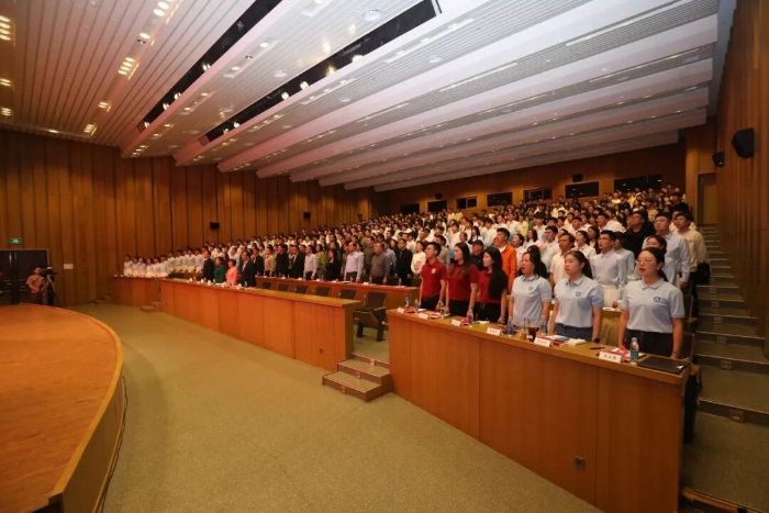 大会在激昂的《歌唱祖国》合唱声中落下帷幕,全体师生挥舞着手中的党旗和国旗,用歌声抒发对祖国的无限热爱与美好祝福。学校相关职能部门和培养单位负责同志、纪念活动广场合唱和志愿服务全体师生以及2025级新生代表共同参与了此次大会。