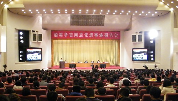 上午9:30,中央宣传部副部长申维辰同志宣布报告会正式开始,在全体起立唱国歌后,先后分别聆听了菊美多吉生前的领导、同事、同学和妻子饱含深情的汇报,学生们对菊美扎根基层,一心为民,甘于奉献的先进事迹感动,更为他把党的温暖带进了高原牧区、深山农户,把广大群众的梦想一步步变成了现实的实干精神所敬佩。菊美多吉同志的妻子昂旺巴姆和报告团其他4位同志,从不同角度、不同侧面追忆了菊美多吉同志生前的先进事迹,回顾了与他工作和生活的日日夜夜,他们的报告感人至深、催人奋进。