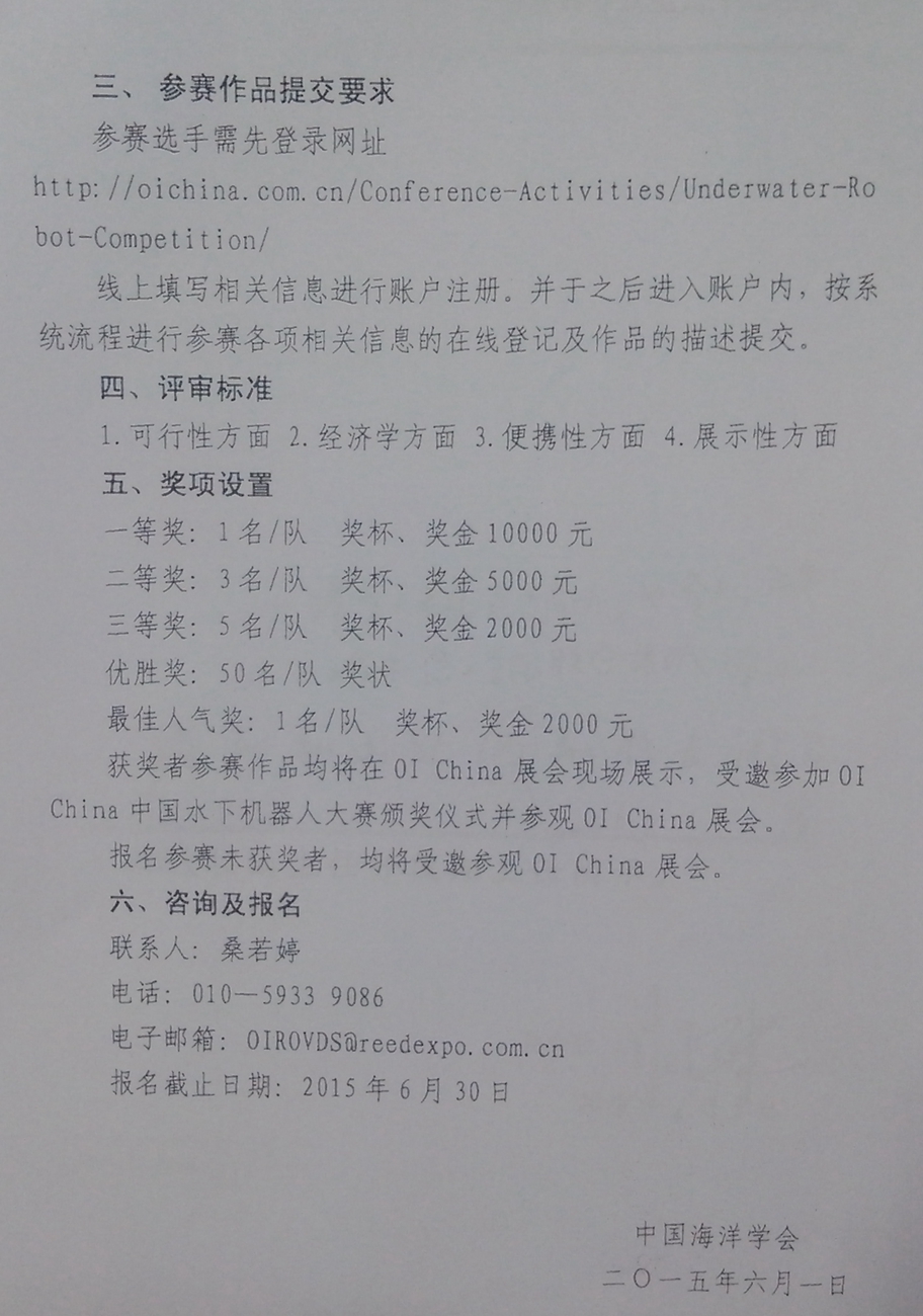 现将中国海洋学会《关于智海2015OI中国水下机器人大赛的参赛通知》转发给你们,请组织感兴趣的学生组队参赛。