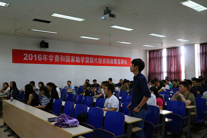 5月19日, 2016年学费和国家助学贷款代偿资助政策宣讲会在综合教学楼802举行,学工处学生资助中心老师、各学院辅导员及100余名学生参加。