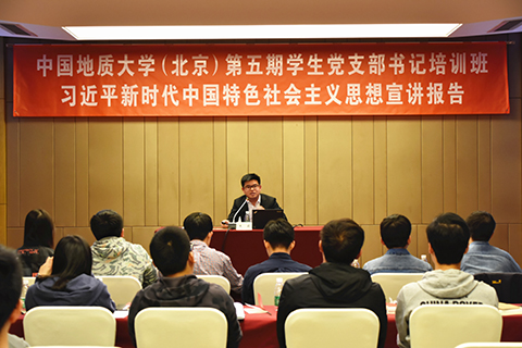 开班仪式后,举行了“学生党支部书记论坛”和“习近平新时代中国特色社会主义思想宣讲报告”。水资源与环境学院S16-2党支部书记任臣意、海洋学院S16党支部书记赵爽、信息工程学院S16研究生党支部书记赵丹宁、地球科学与资源学院本科第一党支部书记董小宇以及马克思主义学院研16级学生党支部书记张振楠在论坛上分享了党支部工作经验和理论学习体会。北京高校学习习近平新时代中国特色社会主义思想博士生宣讲团副团长、清华大学王蔚博士应邀作了题为《续写“春天的故事”,新时代呼唤新青年》的宣讲报告,他围绕新思想、新时代、新世界、新青年四个部分展开,用实例与数据做了深入浅出的解读。