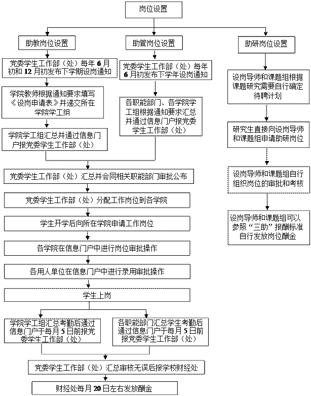党委学生工作部(处)对各单位上报的助教、助管岗位工时和酬金进行统计,审核无误后报财经处,财经处于每月下旬将酬金发放到学生银行卡中。助研岗位酬金由设岗导师或课题组参照“三助”津贴标准自行予以发放。