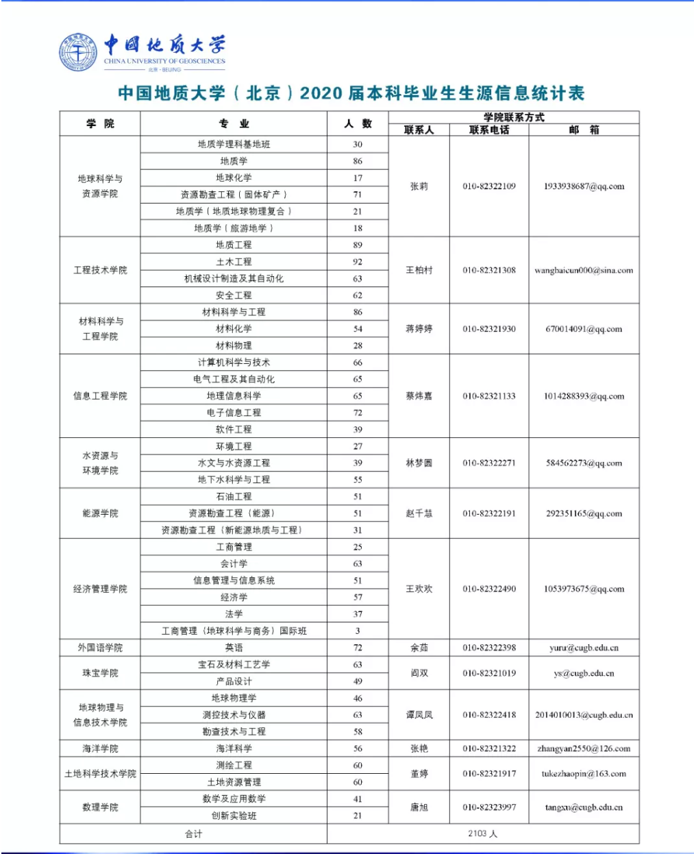 中国地质大学(北京)2020届本科毕业生生源信息统计