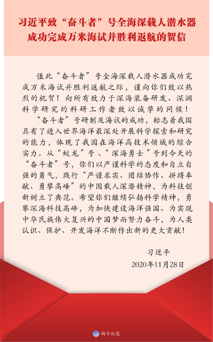 习近平致“奋斗者”号全海深载人潜水器成功完成万米海试并胜利返航的贺信