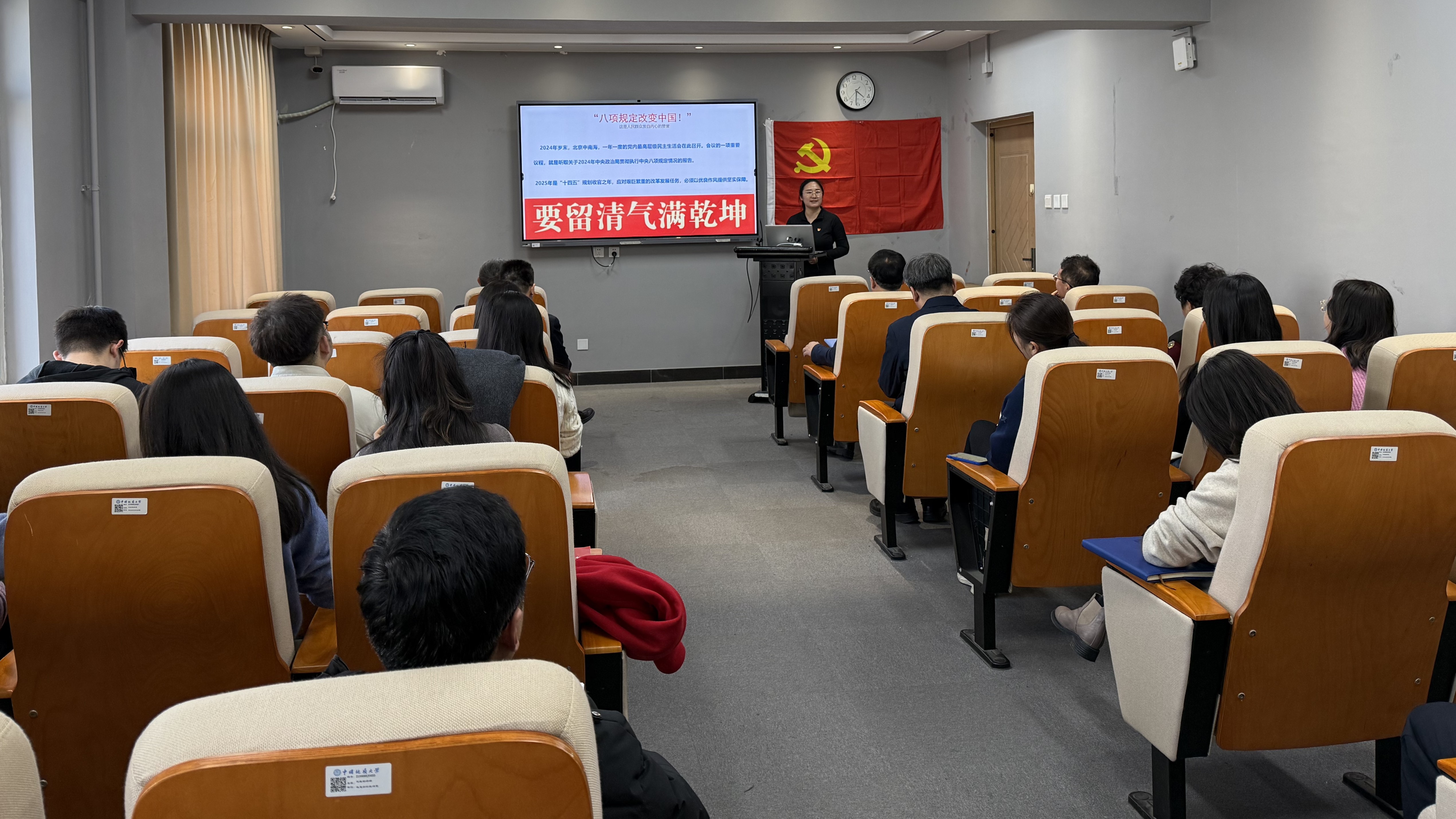 杨润聪副教授主要从“八项规定”的提出、“四风”问题如何破题、“八项规定”的新发展三个部分对改进党员工作作风进行了生动细致的讲解,杨老师提出2025年是“十四五”规划收官之年,应对艰巨繁重的改革发展任务,必须以优良作风提供坚实保障。制定实施中央八项规定,是我们党在新时代的徙木立信之举。八项规定一子落地,党的建设满盘皆活,一场激浊扬清的风气之变随之而来,必须常抓不懈、久久为功,直至真正化风成俗,以优良党风引领社风民风。