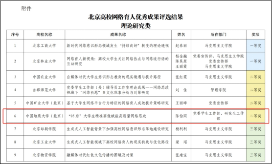 近日,北京高校思想政治工作研究中心发布了关于北京高校网络育人优秀成果评选结果,我校隋明哲、陈怡同两位老师入选。