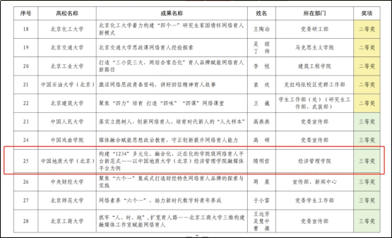 经济管理学院隋明哲老师提交的文章题为《构建1234多元化、融合化、泛在化的学院级网络育人平台新范式—以中国地质大学(北京)经济管理学院融媒体平台为例》荣获工作经验类三等奖,文章强调以学院微信公众号、视频号等为主要阵地,以精准传播、精心设计、精细管理提升网络思政教育渗透力、吸引力、亲和力,打造了一个参与主体多元、内容开放共享、交互空间泛在的“1234”网络育人格局!陈怡同老师提交的论文题为《05后大学生精准画像赋能高质量网络思政》荣获理论研究类二等奖,文章通过打造“精准画像”的价值意蕴、实践经验及经验启示三部分总结了我校开展精准思政的经验举措及成效。